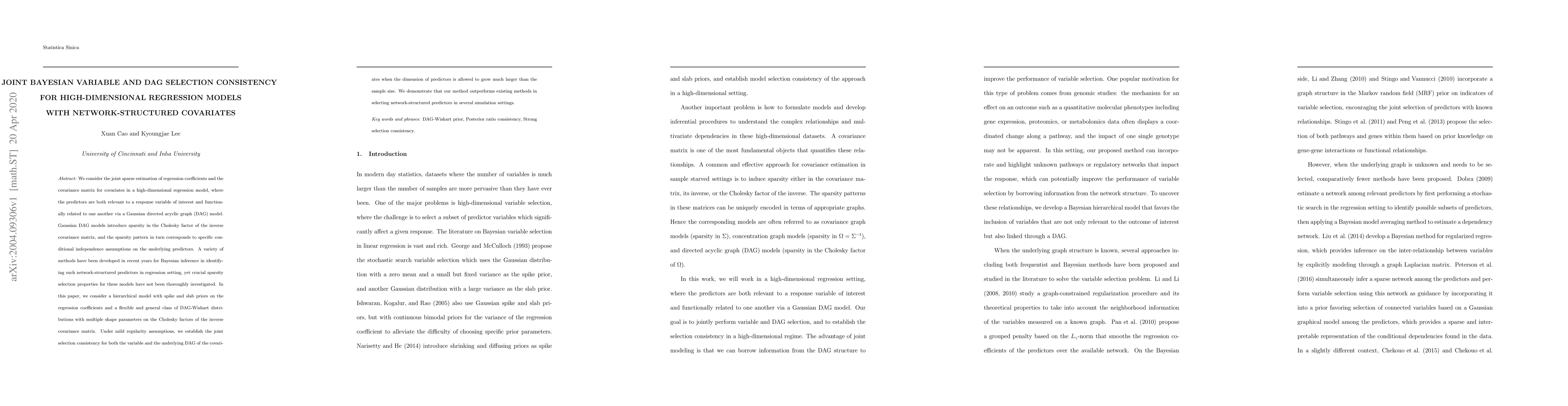 This paper proposes a hierarchical Bayesian model for high-dimensional regression with network-structured covariates, using spike and slab priors and DAG-Wishart distributions. It establishes joint selection consistency for both regression coefficients and the underlying DAG, even when the predictor dimension exceeds the sample size, and shows superior performance in simulations.