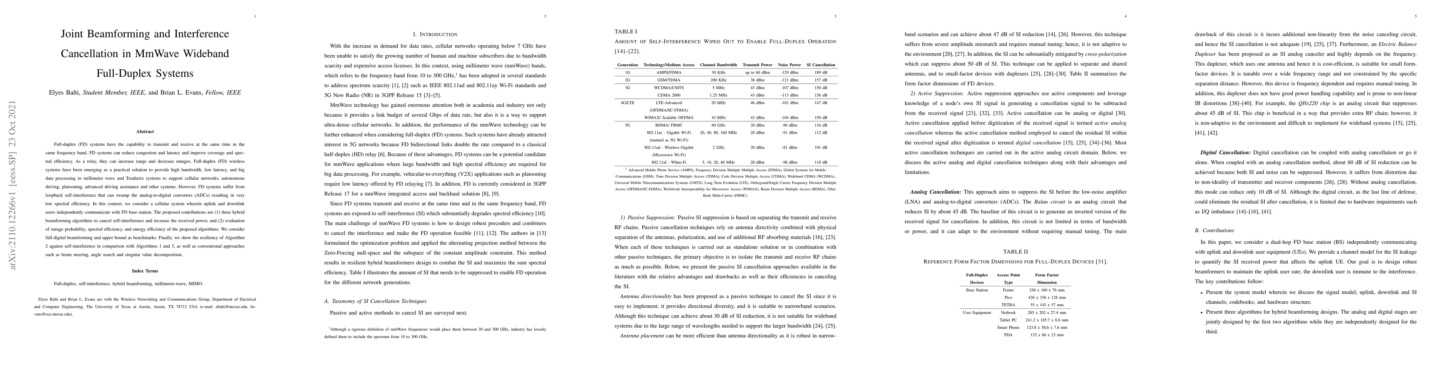 Full-duplex (FD) systems have the capability to transmit and receive at the same time in the same frequency band. FD systems can reduce congestion and latency and improve coverage and spectral efficiency. As a relay, they can increase range and decrease outages. Full-duplex (FD) wireless systems have been emerging as a practical solution to provide high bandwidth, low latency, and big data processing in millimeter wave and Terahertz systems to support cellular networks, autonomous driving, platooning, advanced driving assistance and other systems. However, FD systems suffer from loopback self-interference that can swamp the analog-to-digital converters (ADCs) resulting in very low spectral efficiency. In this context, we consider a cellular system wherein uplink and downlink users independently communicate with FD base station. The proposed contributions are (1) three hybrid beamforming algorithms to cancel self-interference and increase the received power, and (2) evaluation of outage probability, spectral efficiency, and energy efficiency of the proposed algorithms. We consider full-digital beamforming and upper bound as benchmarks. Finally, we show the resiliency of Algorithm 2 against self-interference in comparison with Algorithms 1 and 3, as well as conventional approaches such as beam steering, angle search and singular value decomposition.