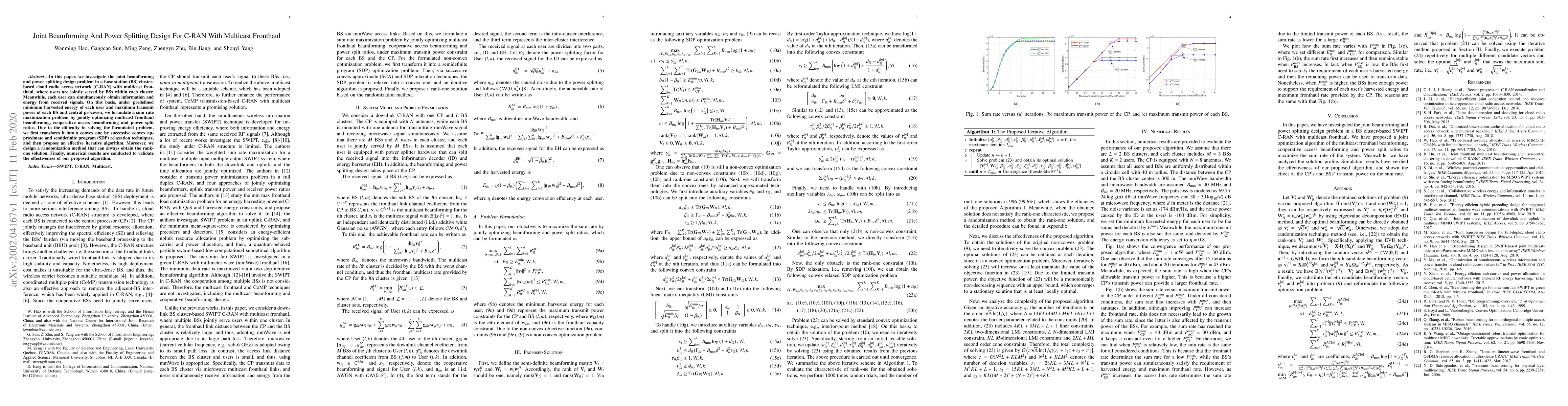 This paper explores optimizing joint beamforming and power splitting in a C-RAN with multicast fronthaul, aiming to maximize sum rate while ensuring minimum energy harvesting and power constraints. An iterative algorithm and a randomization method are proposed to solve the complex optimization problem, validated through numerical results.