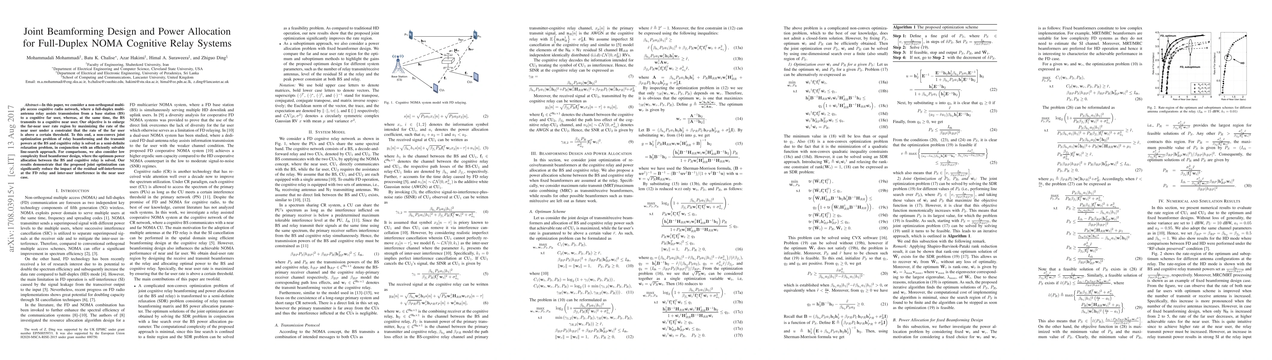 This paper proposes a joint beamforming and power allocation strategy for a full-duplex NOMA cognitive relay system to maximize the near user's rate while ensuring the far user's rate meets a threshold. The optimization problem is solved via semi-definite relaxation and a line-search approach, demonstrating reduced self-interference and inter-user interference compared to fixed beamformer designs.