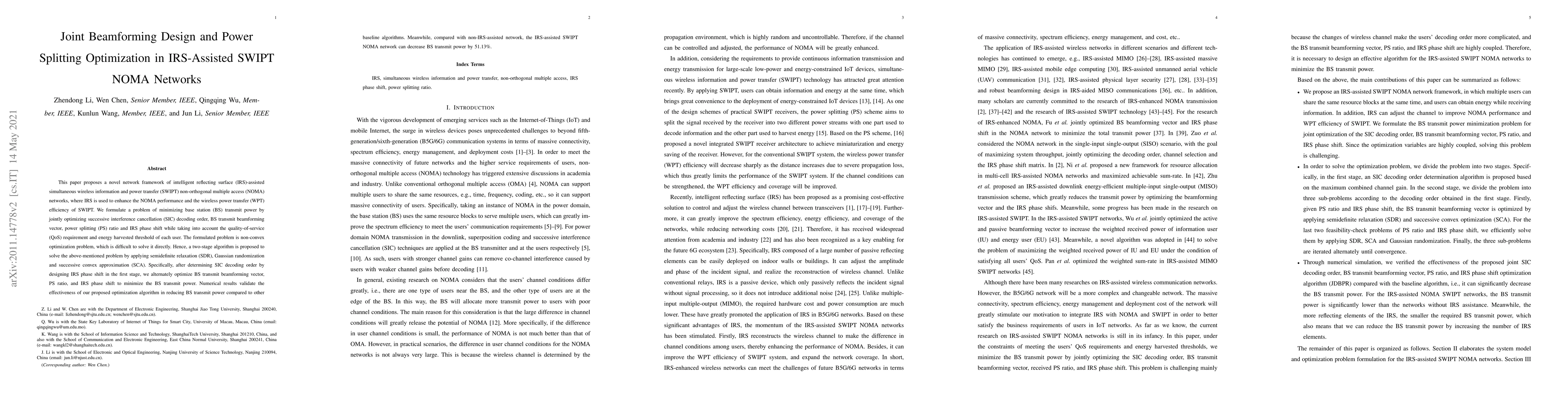 This paper proposes a novel IRS-assisted SWIPT NOMA network framework to enhance performance and efficiency, optimizing power splitting and beamforming to minimize base station transmit power. A two-stage algorithm using SDR, Gaussian randomization, and SCA is developed to solve the non-convex optimization problem, achieving a 51.13% reduction in BS transmit power compared to non-IRS-assisted networks.