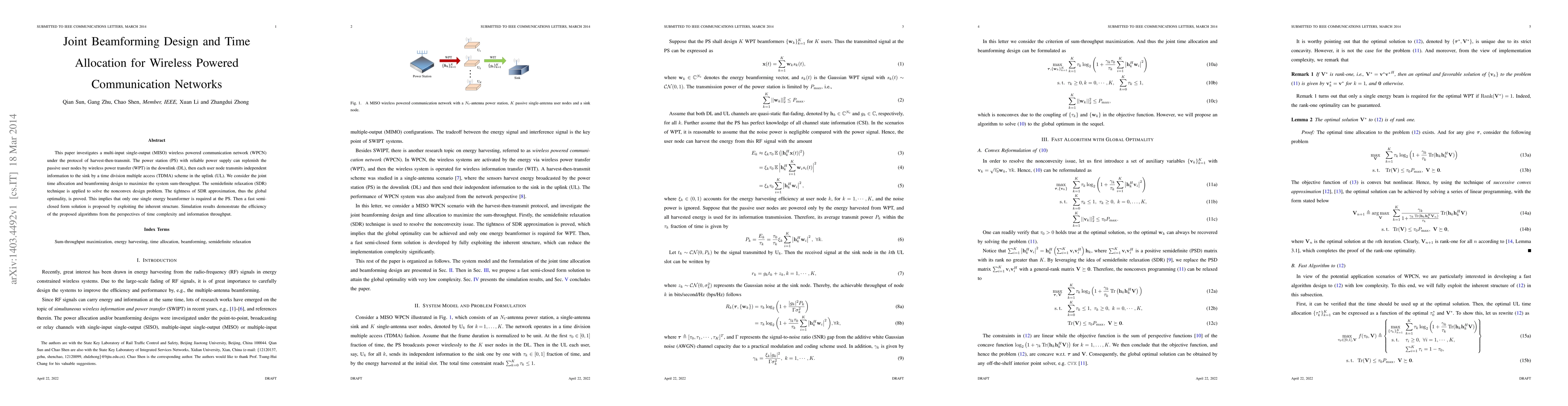 This paper proposes a joint beamforming design and time allocation strategy for a MISO wireless powered communication network under the harvest-then-transmit protocol. The semidefinite relaxation technique is used to solve the nonconvex optimization problem, ensuring global optimality and efficient throughput maximization.
