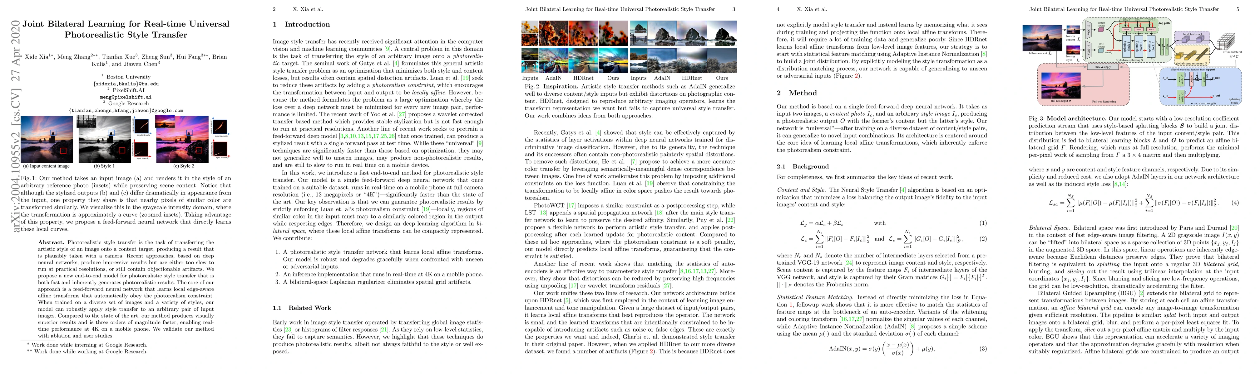 This paper proposes a fast and photorealistic style transfer model using a feed-forward neural network that learns local edge-aware transforms, enabling real-time 4K performance on mobile devices. The method outperforms existing approaches in speed and visual quality, validated through ablation studies and user feedback.