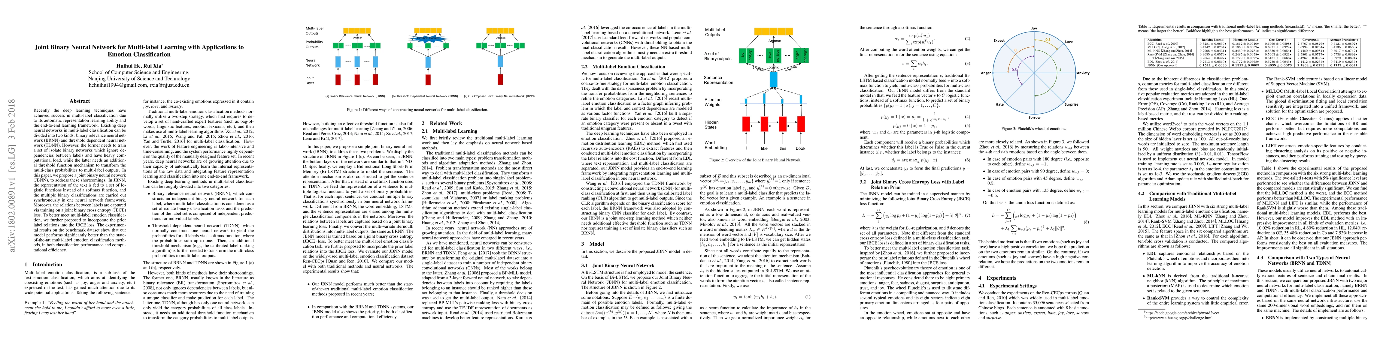 This paper proposes a joint binary neural network (JBNN) to improve multi-label classification, specifically for emotion classification. Unlike traditional methods, JBNN performs multiple binary classifications synchronously within a single network, capturing label dependencies and reducing computational load, leading to better performance and efficiency.