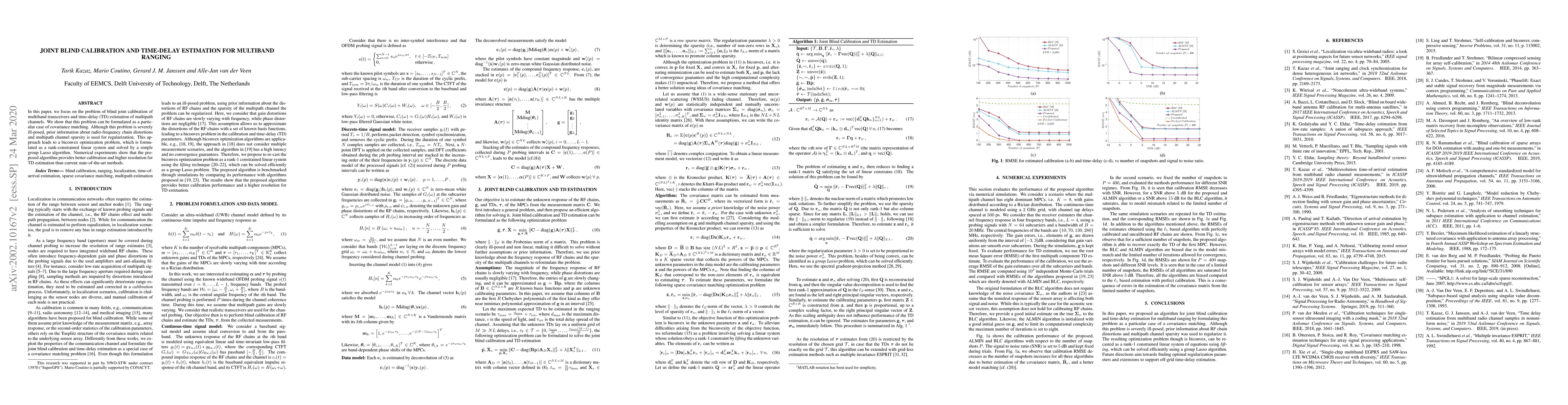 In this paper, we focus on the problem of blind joint calibration of multiband transceivers and time-delay (TD) estimation of multipath channels. We show that this problem can be formulated as a particular case of covariance matching. Although this problem is severely ill-posed, prior information about radio-frequency chain distortions and multipath channel sparsity is used for regularization. This approach leads to a biconvex optimization problem, which is formulated as a rank-constrained linear system and solved by a simple group Lasso algorithm.Numerical experiments show that the proposed algorithm provides better calibration and higher resolution for TD estimation than current state-of-the-art methods.