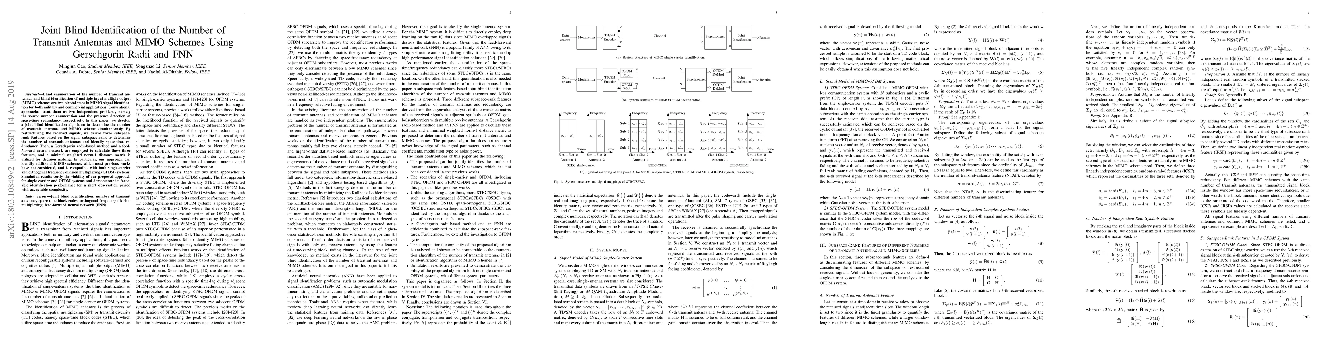 This paper proposes a joint blind identification algorithm for determining the number of transmit antennas and multiple-input multiple-output (MIMO) schemes, using Gerschgorin radii and a feed-forward neural network. The method identifies additional MIMO schemes and is compatible with both single-carrier and OFDM systems, demonstrating favorable performance with acceptable complexity.
