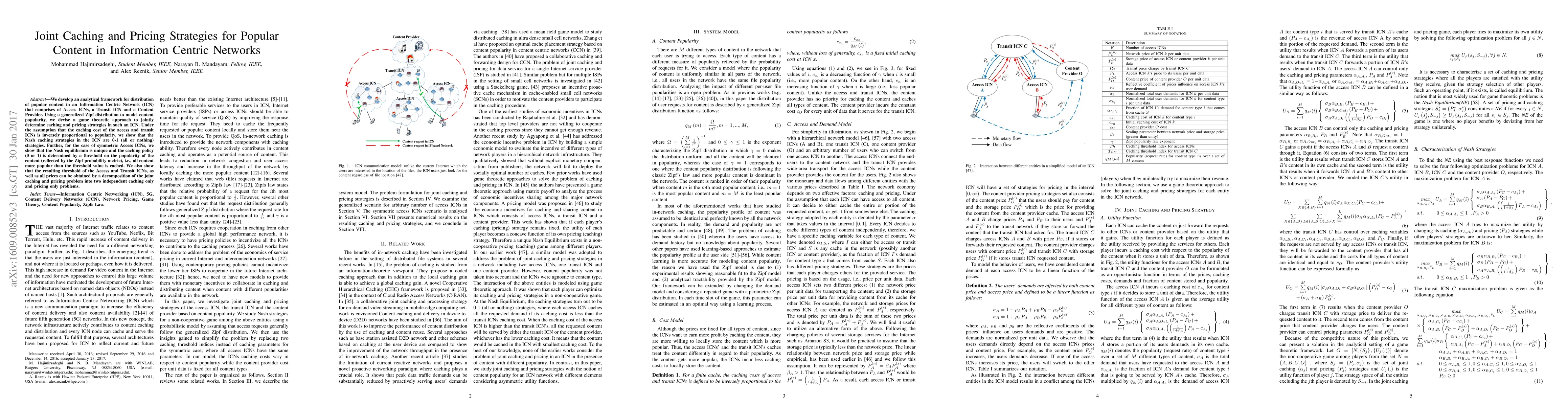 This paper develops an analytical framework for popular content distribution in an Information Centric Network using a game theoretic approach to jointly determine caching and pricing strategies. It finds that Nash caching strategies are binary (0-1) and the equilibrium is unique for symmetric Access ICNs, determined by a popularity threshold.