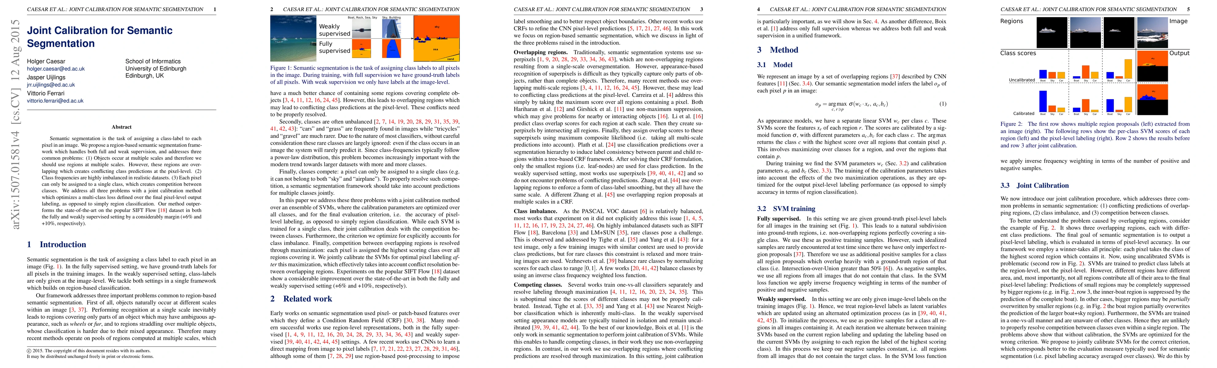 Semantic segmentation is the task of assigning a class-label to each pixel in an image. We propose a region-based semantic segmentation framework which handles both full and weak supervision, and addresses three common problems: (1) Objects occur at multiple scales and therefore we should use regions at multiple scales. However, these regions are overlapping which creates conflicting class predictions at the pixel-level. (2) Class frequencies are highly imbalanced in realistic datasets. (3) Each pixel can only be assigned to a single class, which creates competition between classes. We address all three problems with a joint calibration method which optimizes a multi-class loss defined over the final pixel-level output labeling, as opposed to simply region classification. Our method outperforms the state-of-the-art on the popular SIFT Flow [18] dataset in both the fully and weakly supervised setting by a considerably margin (+6% and +10%, respectively).