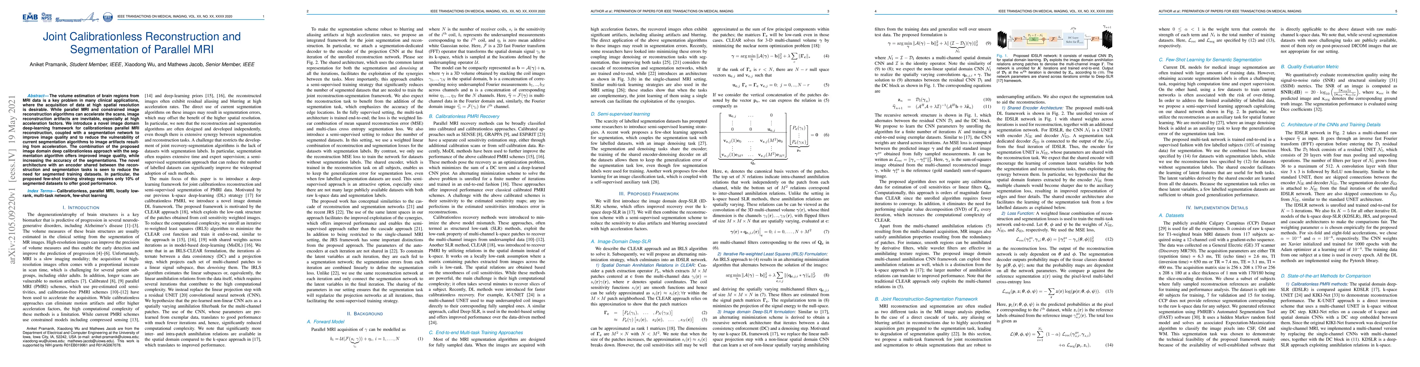 This paper presents a novel deep-learning framework for calibrationless reconstruction of parallel MRI, coupled with a segmentation network to enhance image quality and reduce segmentation errors due to reconstruction artifacts. The shared encoder architecture and few-shot training strategy improve segmentation accuracy while minimizing the need for extensive labeled datasets.