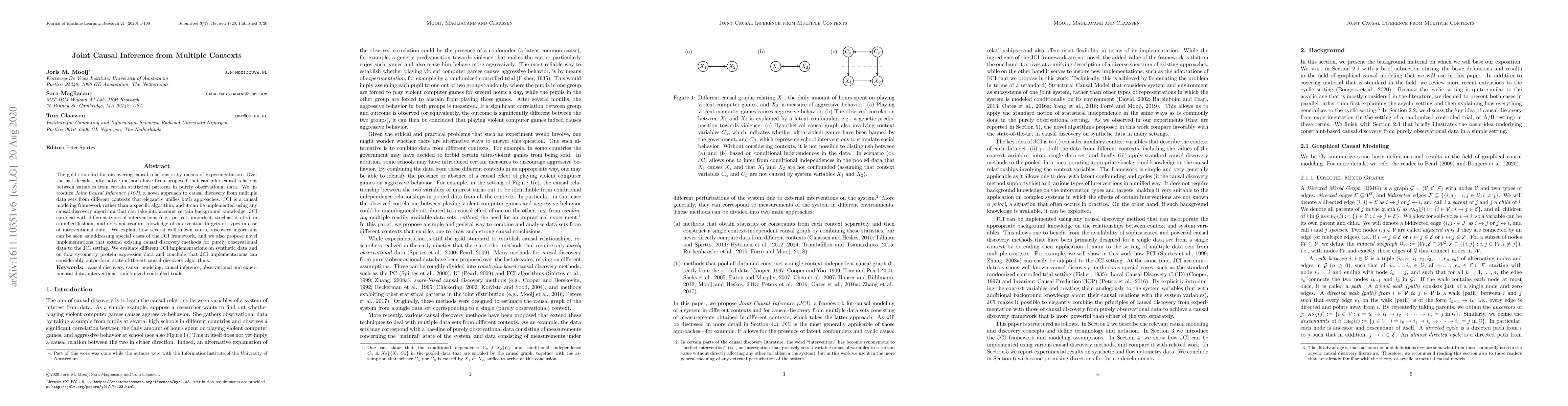 The gold standard for discovering causal relations is by means of experimentation. Over the last decades, alternative methods have been proposed that can infer causal relations between variables from certain statistical patterns in purely observational data. We introduce Joint Causal Inference (JCI), a novel approach to causal discovery from multiple data sets from different contexts that elegantly unifies both approaches. JCI is a causal modeling framework rather than a specific algorithm, and it can be implemented using any causal discovery algorithm that can take into account certain background knowledge. JCI can deal with different types of interventions (e.g., perfect, imperfect, stochastic, etc.) in a unified fashion, and does not require knowledge of intervention targets or types in case of interventional data. We explain how several well-known causal discovery algorithms can be seen as addressing special cases of the JCI framework, and we also propose novel implementations that extend existing causal discovery methods for purely observational data to the JCI setting. We evaluate different JCI implementations on synthetic data and on flow cytometry protein expression data and conclude that JCI implementations can considerably outperform state-of-the-art causal discovery algorithms.