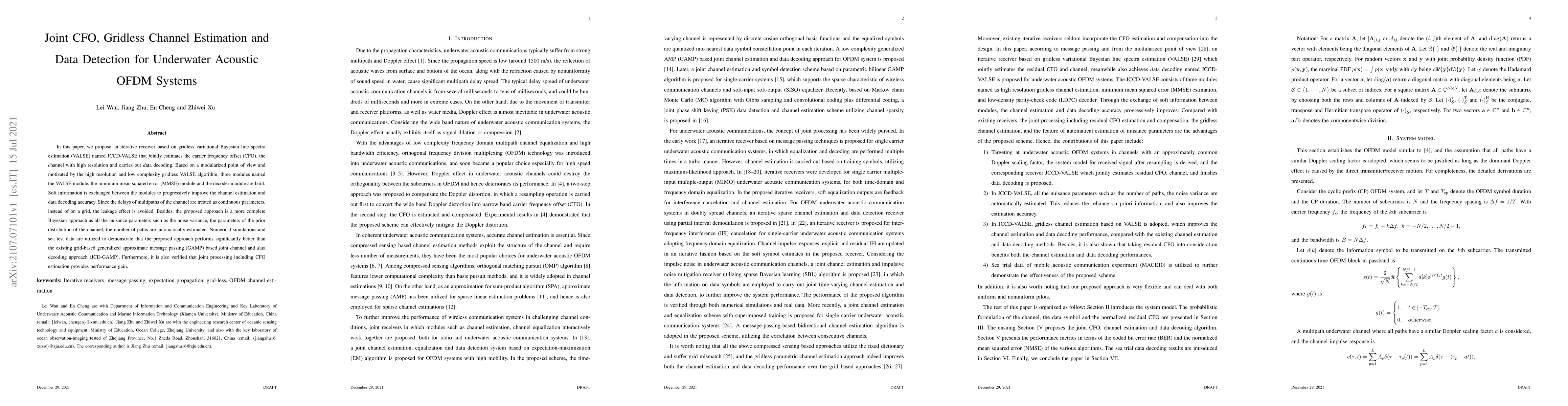 In this paper, we propose an iterative receiver based on gridless variational Bayesian line spectra estimation (VALSE) named JCCD-VALSE that \emph{j}ointly estimates the \emph{c}arrier frequency offset (CFO), the \emph{c}hannel with high resolution and carries out \emph{d}ata decoding. Based on a modularized point of view and motivated by the high resolution and low complexity gridless VALSE algorithm, three modules named the VALSE module, the minimum mean squared error (MMSE) module and the decoder module are built. Soft information is exchanged between the modules to progressively improve the channel estimation and data decoding accuracy. Since the delays of multipaths of the channel are treated as continuous parameters, instead of on a grid, the leakage effect is avoided. Besides, the proposed approach is a more complete Bayesian approach as all the nuisance parameters such as the noise variance, the parameters of the prior distribution of the channel, the number of paths are automatically estimated. Numerical simulations and sea test data are utilized to demonstrate that the proposed approach performs significantly better than the existing grid-based generalized approximate message passing (GAMP) based \emph{j}oint \emph{c}hannel and \emph{d}ata decoding approach (JCD-GAMP). Furthermore, it is also verified that joint processing including CFO estimation provides performance gain.