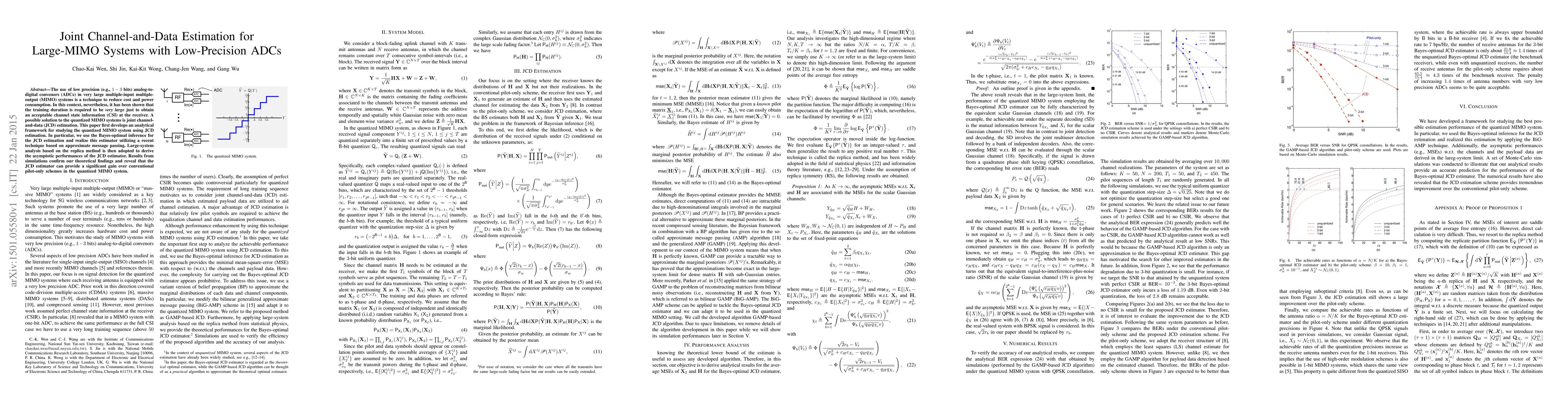 This paper develops an analytical framework for joint channel-and-data estimation in large-MIMO systems using low-precision ADCs, employing Bayes-optimal inference and approximate message passing. Simulation results show significant performance gains over conventional pilot-only schemes.
