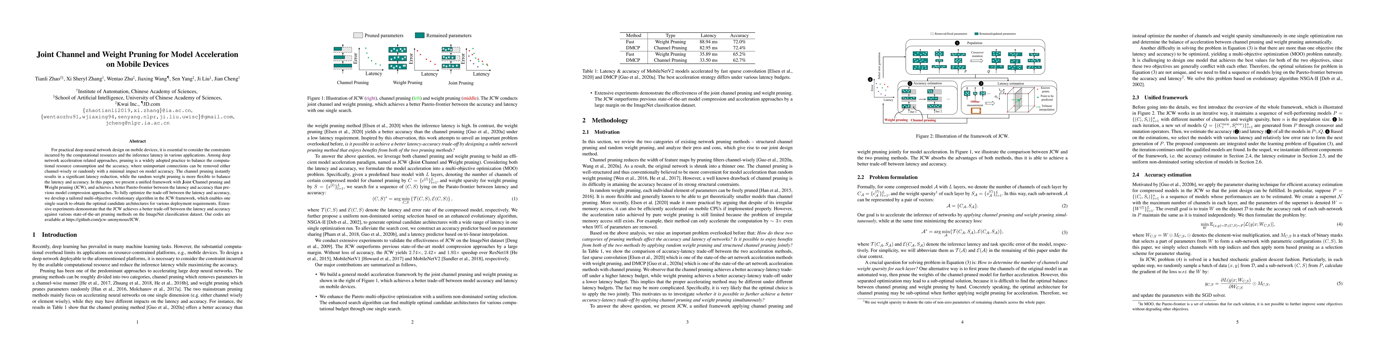 This paper proposes a Joint Channel and Weight Pruning (JCW) framework for accelerating deep neural networks on mobile devices, achieving a superior balance between latency and accuracy compared to existing methods. The tailored multi-objective evolutionary algorithm within the JCW framework optimizes the trade-off, demonstrating better performance on the ImageNet dataset.