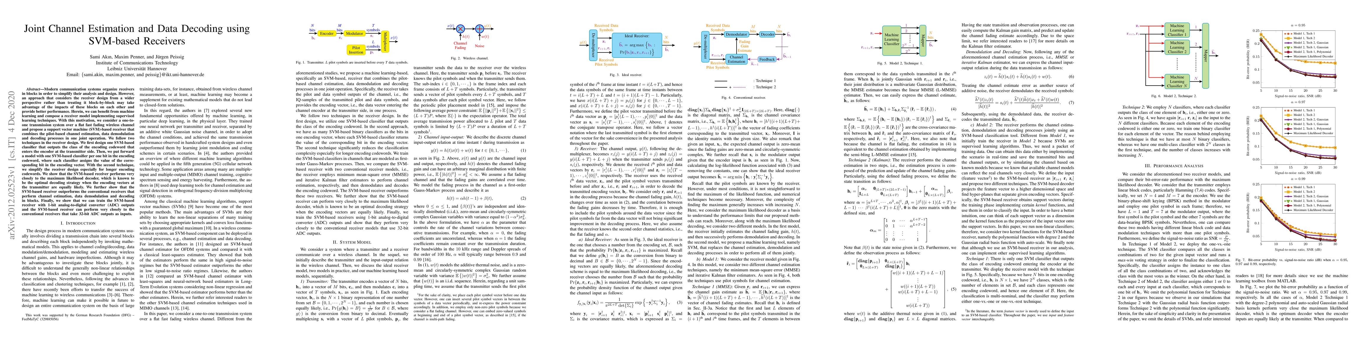 This research proposes an SVM-based receiver that integrates channel estimation, data demodulation, and decoding into a single operation, performing closely to the maximum likelihood decoder. It outperforms conventional block-wise receivers and can be trained with low-resolution 1-bit ADC outputs, matching the performance of receivers using high-resolution 32-bit ADC inputs.