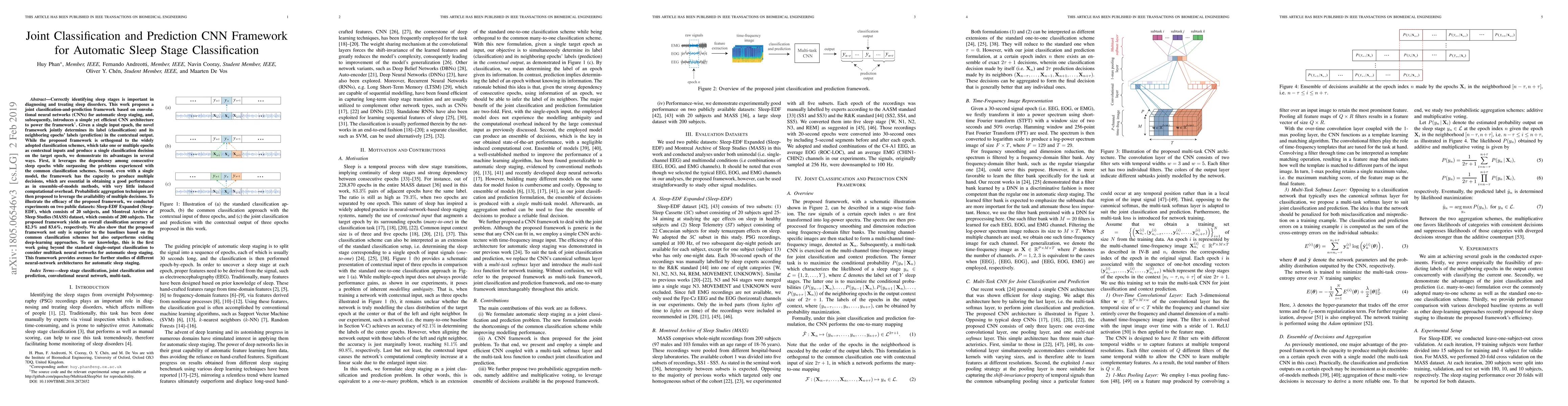 Correctly identifying sleep stages is important in diagnosing and treating sleep disorders. This work proposes a joint classification-and-prediction framework based on CNNs for automatic sleep staging, and, subsequently, introduces a simple yet efficient CNN architecture to power the framework. Given a single input epoch, the novel framework jointly determines its label (classification) and its neighboring epochs' labels (prediction) in the contextual output. While the proposed framework is orthogonal to the widely adopted classification schemes, which take one or multiple epochs as contextual inputs and produce a single classification decision on the target epoch, we demonstrate its advantages in several ways. First, it leverages the dependency among consecutive sleep epochs while surpassing the problems experienced with the common classification schemes. Second, even with a single model, the framework has the capacity to produce multiple decisions, which are essential in obtaining a good performance as in ensemble-of-models methods, with very little induced computational overhead. Probabilistic aggregation techniques are then proposed to leverage the availability of multiple decisions. We conducted experiments on two public datasets: Sleep-EDF Expanded with 20 subjects, and Montreal Archive of Sleep Studies dataset with 200 subjects. The proposed framework yields an overall classification accuracy of 82.3% and 83.6%, respectively. We also show that the proposed framework not only is superior to the baselines based on the common classification schemes but also outperforms existing deep-learning approaches. To our knowledge, this is the first work going beyond the standard single-output classification to consider multitask neural networks for automatic sleep staging. This framework provides avenues for further studies of different neural-network architectures for automatic sleep staging.