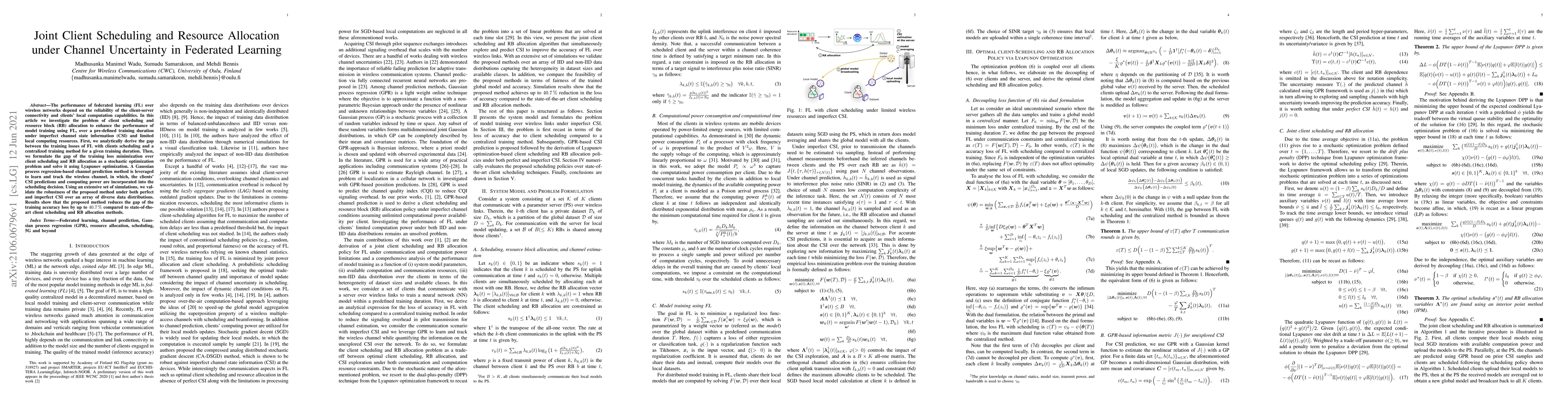 The performance of federated learning (FL) over wireless networks depend on the reliability of the client-server connectivity and clients' local computation capabilities. In this article we investigate the problem of client scheduling and resource block (RB) allocation to enhance the performance of model training using FL, over a pre-defined training duration under imperfect channel state information (CSI) and limited local computing resources. First, we analytically derive the gap between the training losses of FL with clients scheduling and a centralized training method for a given training duration. Then, we formulate the gap of the training loss minimization over client scheduling and RB allocation as a stochastic optimization problem and solve it using Lyapunov optimization. A Gaussian process regression-based channel prediction method is leveraged to learn and track the wireless channel, in which, the clients' CSI predictions and computing power are incorporated into the scheduling decision. Using an extensive set of simulations, we validate the robustness of the proposed method under both perfect and imperfect CSI over an array of diverse data distributions. Results show that the proposed method reduces the gap of the training accuracy loss by up to 40.7% compared to state-of-theart client scheduling and RB allocation methods.