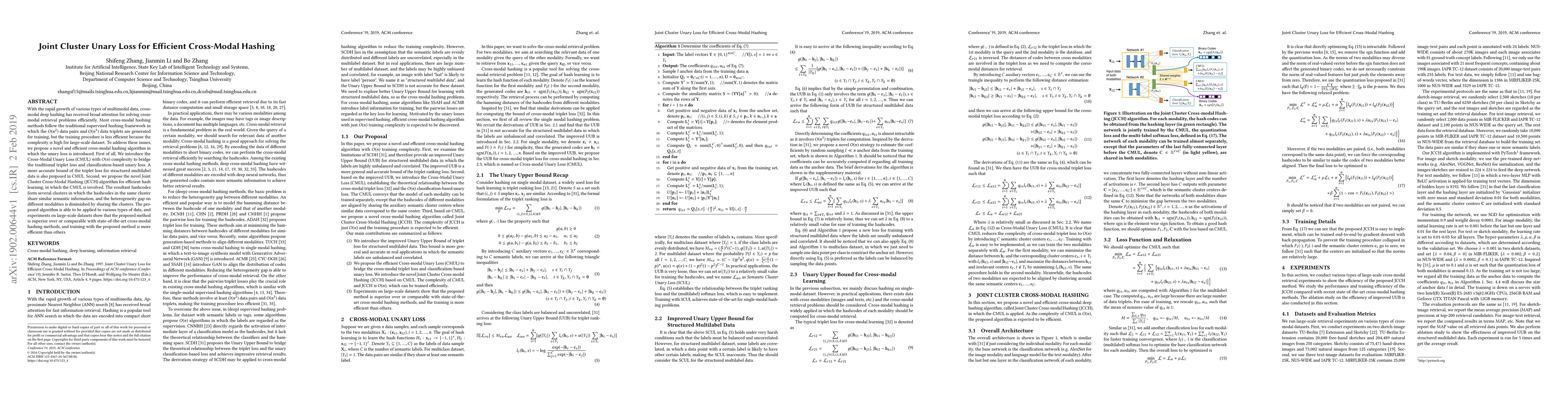 The paper proposes a novel Joint Cluster Unary Loss for efficient cross-modal hashing, introducing the Cross-Modal Unary Loss (CMUL) with $O(n)$ complexity to bridge traditional triplet loss and classification-based unary loss, and the Joint Cluster Cross-Modal Hashing (JCCH) algorithm for efficient hash learning, demonstrating superior performance and efficiency on large-scale datasets.