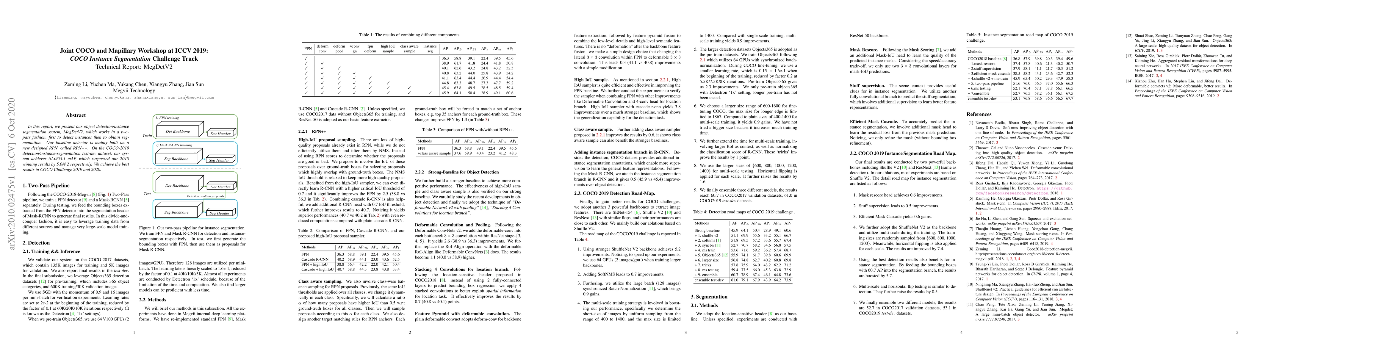 In this report, we present our object detection/instance segmentation system, MegDetV2, which works in a two-pass fashion, first to detect instances then to obtain segmentation. Our baseline detector is mainly built on a new designed RPN, called RPN++. On the COCO-2019 detection/instance-segmentation test-dev dataset, our system achieves 61.0/53.1 mAP, which surpassed our 2018 winning results by 5.0/4.2 respectively. We achieve the best results in COCO Challenge 2019 and 2020.