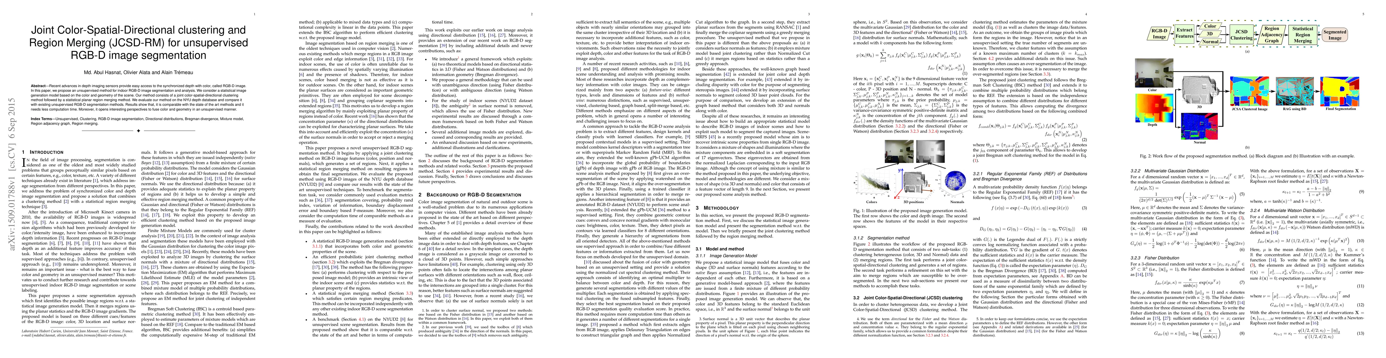 This paper proposes an unsupervised method for segmenting indoor RGB-D images using joint color-spatial-directional clustering and a statistical planar region merging technique. The method is evaluated on the NYU depth database, showing competitive performance with less computation time compared to existing methods.