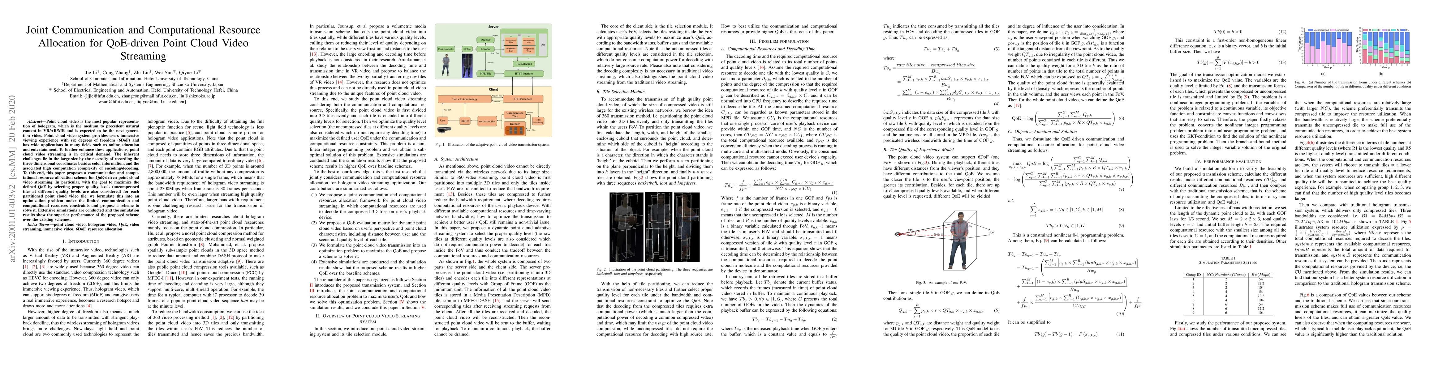 This paper proposes a joint communication and computational resource allocation scheme to enhance QoE for point cloud video streaming, addressing the challenges of large data size and high encoding complexity. The scheme optimizes resource utilization by selecting appropriate transmission forms and quality levels, demonstrating superior performance in simulations compared to existing methods.