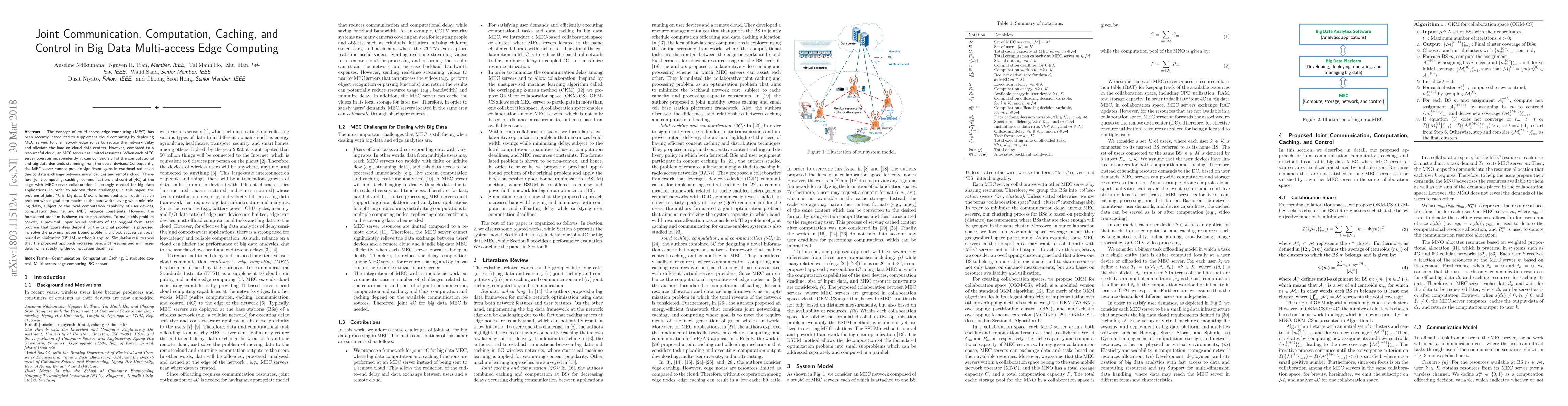 The concept of multi-access edge computing (MEC) has been recently introduced to supplement cloud computing by deploying MEC servers to the network edge so as to reduce the network delay and alleviate the load on cloud data centers. However, compared to a resourceful cloud, an MEC server has limited resources. When each MEC server operates independently, it cannot handle all of the computational and big data demands stemming from the users devices. Consequently, the MEC server cannot provide significant gains in overhead reduction due to data exchange between users devices and remote cloud. Therefore, joint computing, caching, communication, and control (4C) at the edge with MEC server collaboration is strongly needed for big data applications. In order to address these challenges, in this paper, the problem of joint 4C in big data MEC is formulated as an optimization problem whose goal is to maximize the bandwidth saving while minimizing delay, subject to the local computation capability of user devices, computation deadline, and MEC resource constraints. However, the formulated problem is shown to be non-convex. To make this problem convex, a proximal upper bound problem of the original formulated problem that guarantees descent to the original problem is proposed. To solve the proximal upper bound problem, a block successive upper bound minimization (BSUM) method is applied. Simulation results show that the proposed approach increases bandwidth-saving and minimizes delay while satisfying the computation deadlines.