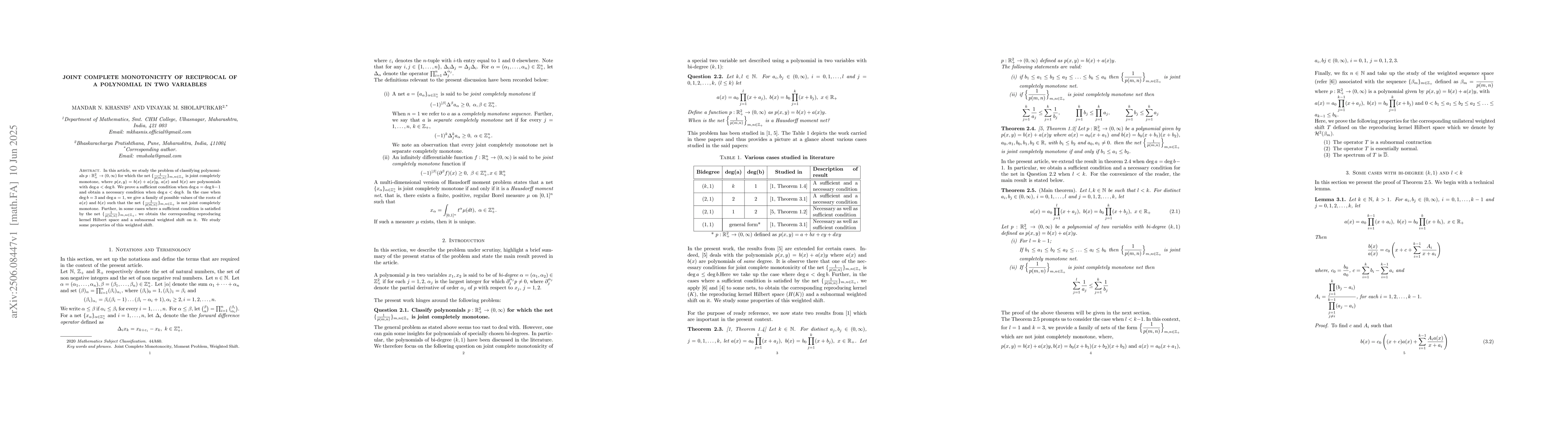 In this article, we study the problem of classifying polynomials $p:\mathbb{R}^2_+\to (0,\infty)$ for which the net $\{\frac{1}{p(m,n)}\}_{m,n\in \mathbb{Z}_+}$ is joint completely monotone, where $p(x,y)=b(x)+a(x)y$, $a(x)$ and $b(x)$ are polynomials with $deg(a) < deg(b)$. We prove a sufficient condition when $deg(a) = deg(b)-1$ and obtain a necessary condition when $deg(a) < deg(b)$. In the case when $deg(b)=3$ and $deg(a)=1$, we give a family of possible values of the roots of $a(x)$ and $b(x)$ such that the net $\{\frac{1}{p(m,n)}\}_{m,n\in \mathbb{Z}_+}$ is not joint completely monotone. Further, in some cases where a sufficient condition is satisfied by the net $\{\frac{1}{p(m,n)}\}_{m,n\in \mathbb{Z}_+}$, we obtain the corresponding reproducing kernel Hilbert space and a subnormal weighted shift on it. We study some properties of this weighted shift.