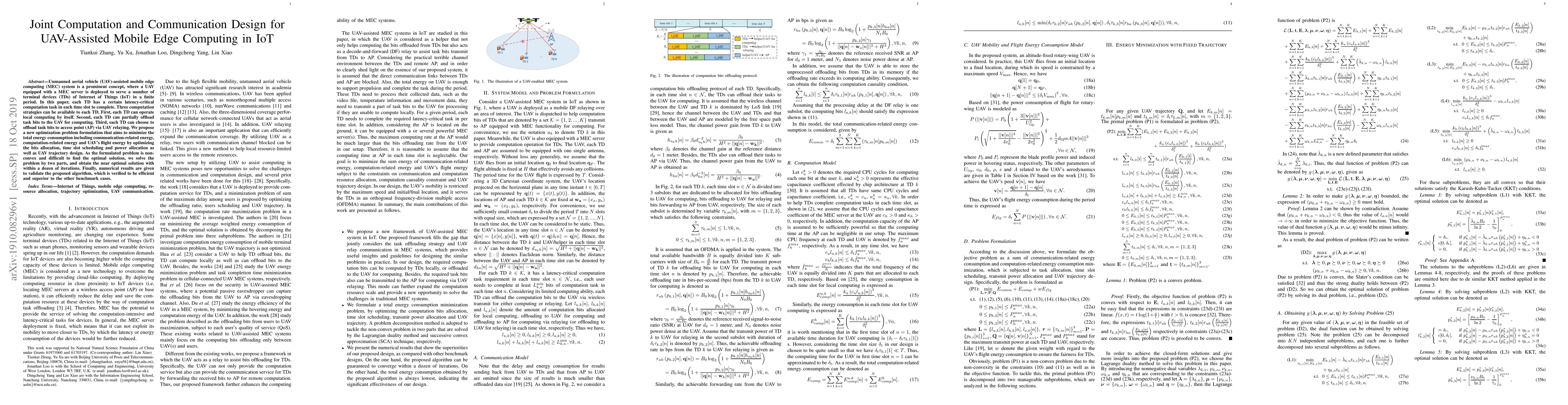 This paper proposes an optimization framework for UAV-assisted mobile edge computing in IoT, aiming to minimize total energy consumption through joint computation and communication strategies. The solution is derived via iterative methods to achieve near-optimal performance, outperforming benchmark cases.