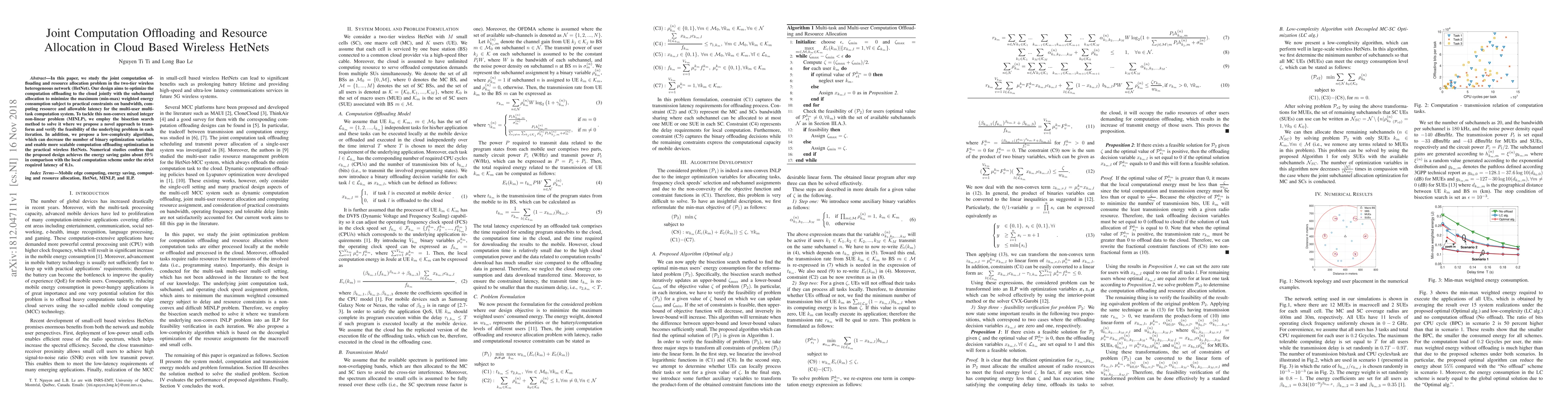 This paper addresses the optimization of computation offloading and resource allocation in cloud-based wireless heterogeneous networks (HetNets) to minimize weighted energy consumption. It employs a bisection search method to solve the non-convex mixed integer non-linear problem, proposing a low-complexity algorithm for scalable optimization, achieving about 55% energy savings compared to local computation under strict latency constraints.