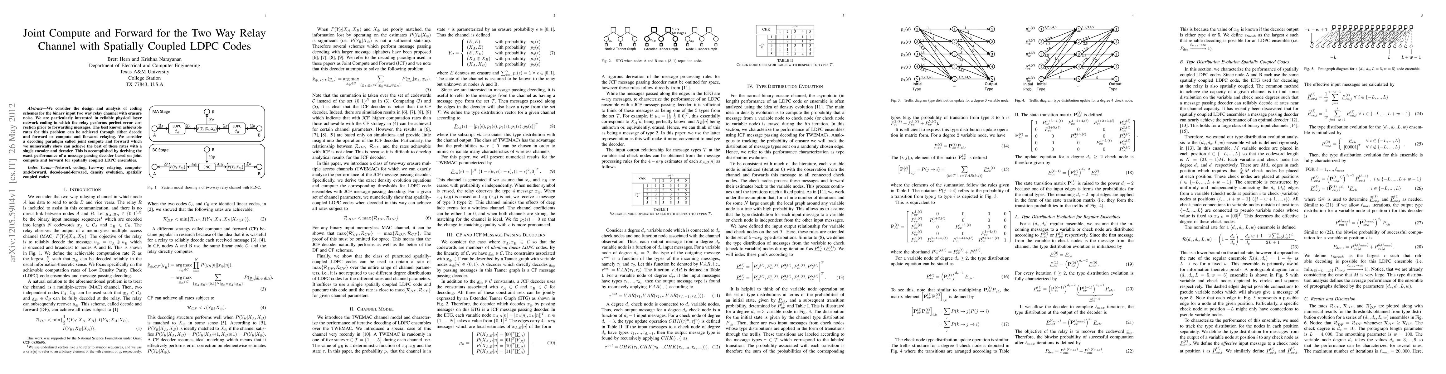 We consider the design and analysis of coding schemes for the binary input two way relay channel with erasure noise. We are particularly interested in reliable physical layer network coding in which the relay performs perfect error correction prior to forwarding messages. The best known achievable rates for this problem can be achieved through either decode and forward or compute and forward relaying. We consider a decoding paradigm called joint compute and forward which we numerically show can achieve the best of these rates with a single encoder and decoder. This is accomplished by deriving the exact performance of a message passing decoder based on joint compute and forward for spatially coupled LDPC ensembles.