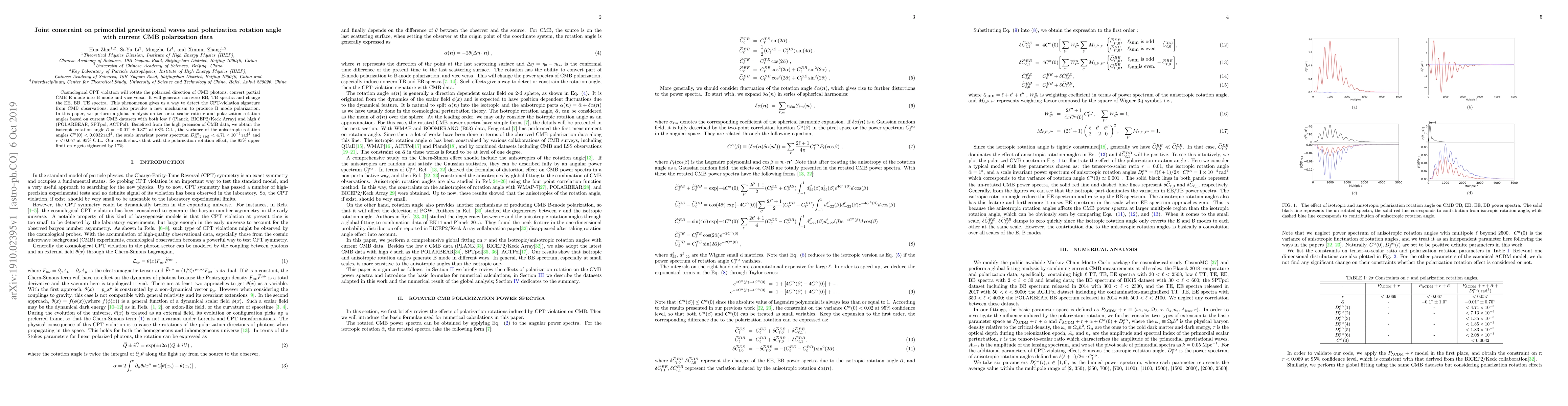 Cosmological CPT violation will rotate the polarized direction of CMB photons, convert partial CMB E mode into B mode and vice versa. It will generate non-zero EB, TB spectra and change the EE, BB, TE spectra. This phenomenon gives us a way to detect the CPT-violation signature from CMB observations, and also provides a new mechanism to produce B mode polarization. In this paper, we perform a global analysis on tensor-to-scalar ratio $r$ and polarization rotation angles based on current CMB datasets with both low $\ell$ (Planck, BICEP2/Keck Array) and high $\ell$ (POLARBEAR, SPTpol, ACTPol). Benefited from the high precision of CMB data, we obtain the isotropic rotation angle $\bar{\alpha} = -0.01^\circ \pm 0.37^\circ $ at 68% C.L., the variance of the anisotropic rotation angles $C^{\alpha}(0)<0.0032\,\mathrm{rad}^2$, the scale invariant power spectrum $D^{\alpha\alpha}_{\ell \in [2, 350]}<4.71\times 10^{-5} \,\mathrm{rad}^2$ and $r<0.057$ at 95% C.L.. Our result shows that with the polarization rotation effect, the 95% upper limit on $r$ gets tightened by 17%.