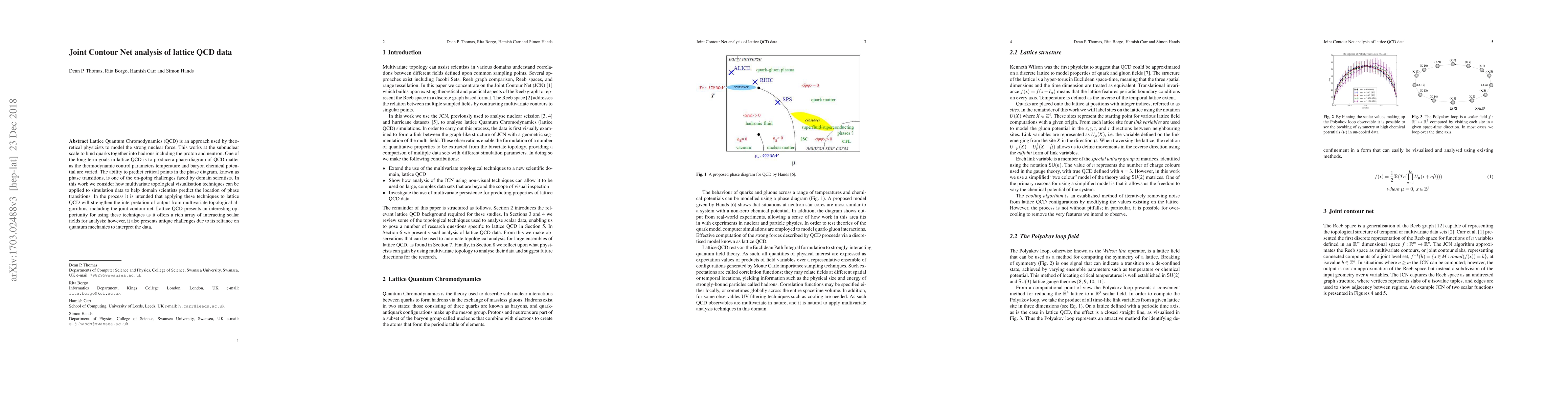 Lattice Quantum Chromodynamics (QCD) is an approach used by theoretical physicists to model the strong nuclear force. This works at the sub-nuclear scale to bind quarks together into hadrons including the proton and neutron. One of the long term goals in lattice QCD is to produce a phase diagram of QCD matter as thermodynamic control parameters temperature and baryon chemical potential are varied. The ability to predict critical points in the phase diagram, known as phase transitions, is one of the on-going challenges faced by domain scientists. In this work we consider how multivariate topological visualisation techniques can be applied to simulation data to help domain scientists predict the location of phase transitions. In the process it is intended that applying these techniques to lattice QCD will strengthen the interpretation of output from multivariate topological algorithms, including the joint contour net. Lattice QCD presents an interesting opportunity for using these techniques as it offers a rich array of interacting scalar fields for analysis; however, it also presents unique challenges due to its reliance on quantum mechanics to interpret the data.