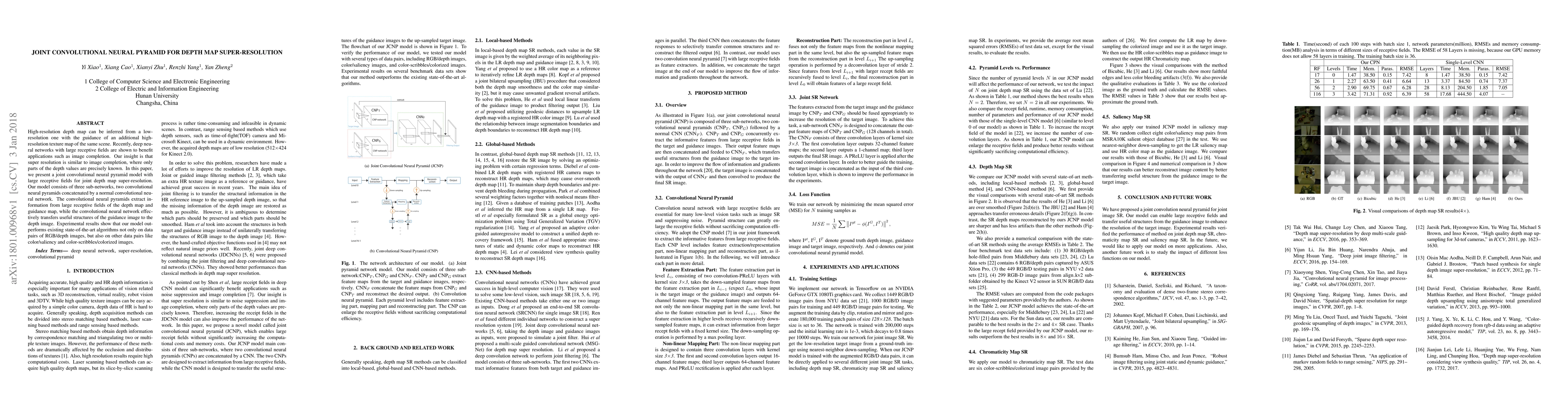 This paper proposes a joint convolutional neural pyramid model for depth map super-resolution, leveraging large receptive fields to enhance resolution from low-resolution depth maps using high-resolution texture guidance. The model combines two convolutional neural pyramids and a convolutional neural network, achieving superior performance compared to existing algorithms across various data pairs.