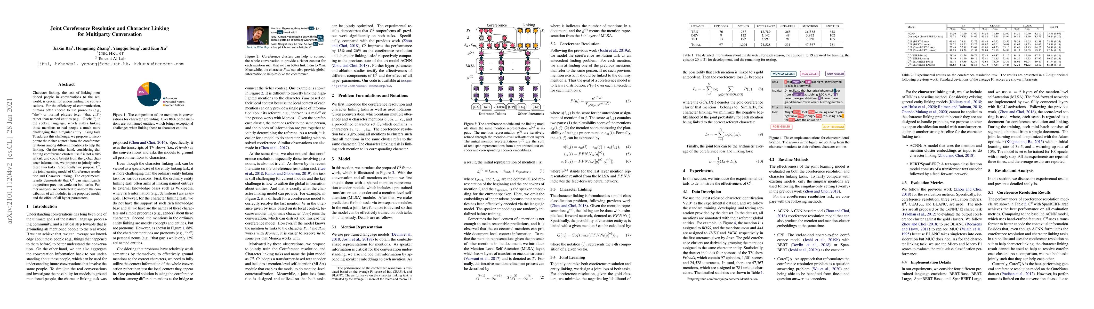 This paper proposes a joint learning model, C$^2$, to simultaneously perform coreference resolution and character linking in multiparty conversations. The model leverages context from coreference relations to improve the challenging task of linking pronouns and phrases to real-world entities, achieving significant performance improvements over previous methods.