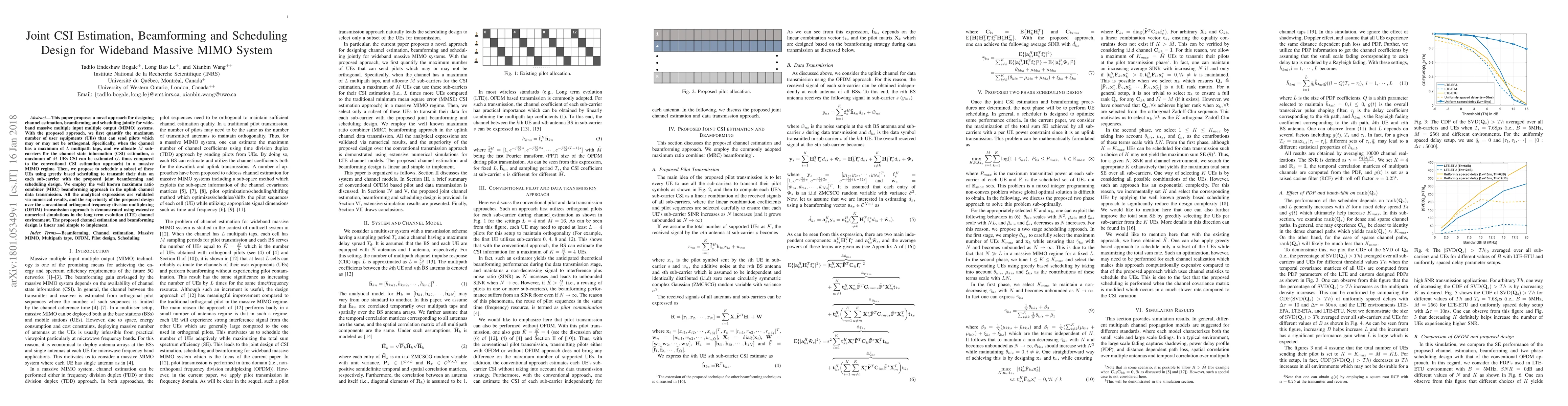 This paper proposes a joint design for channel estimation, beamforming, and scheduling in wideband massive MIMO systems, enabling the estimation of $\tilde{M}$ UEs' CSI with $\tilde{M}$ sub-carriers, significantly improving over conventional methods. The approach employs greedy scheduling and MRC beamforming, validated by numerical results showing superior performance compared to conventional OFDM in LTE environments.