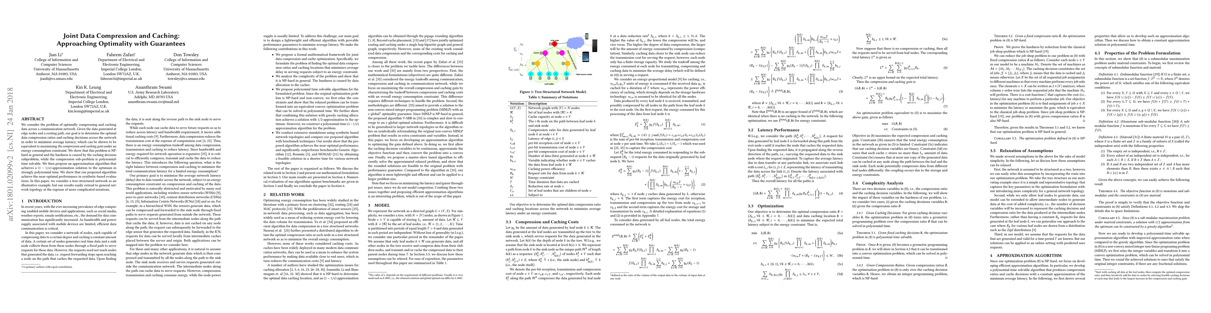We consider the problem of optimally compressing and caching data across a communication network. Given the data generated at edge nodes and a routing path, our goal is to determine the optimal data compression ratios and caching decisions across the network in order to minimize average latency, which can be shown to be equivalent to maximizing the compression and caching gain under an energy consumption constraint. We show that this problem is NP-hard in general and the hardness is caused by the caching decision subproblem, while the compression sub-problem is polynomial-time solvable. We then propose an approximation algorithm that achieves a $(1-1/e)$-approximation solution to the optimum in strongly polynomial time. We show that our proposed algorithm achieve the near-optimal performance in synthetic-based evaluations. In this paper, we consider a tree-structured network as an illustrative example, but our results easily extend to general network topology at the expense of more complicated notations.