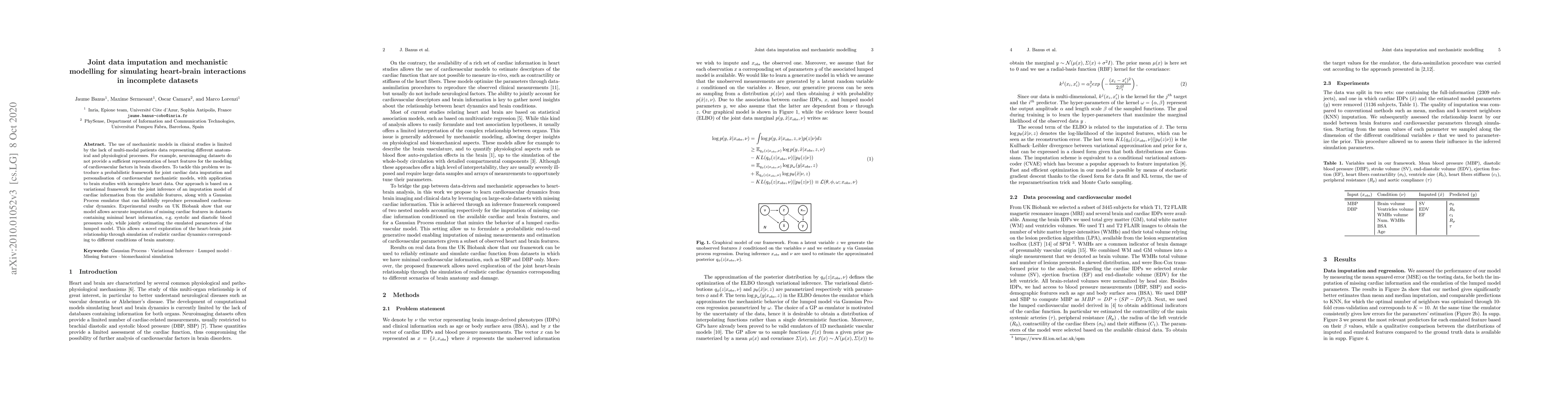 The use of mechanistic models in clinical studies is limited by the lack of multi-modal patients data representing different anatomical and physiological processes. For example, neuroimaging datasets do not provide a sufficient representation of heart features for the modeling of cardiovascular factors in brain disorders. To tackle this problem we introduce a probabilistic framework for joint cardiac data imputation and personalisation of cardiovascular mechanistic models, with application to brain studies with incomplete heart data. Our approach is based on a variational framework for the joint inference of an imputation model of cardiac information from the available features, along with a Gaussian Process emulator that can faithfully reproduce personalised cardiovascular dynamics. Experimental results on UK Biobank show that our model allows accurate imputation of missing cardiac features in datasets containing minimal heart information, e.g. systolic and diastolic blood pressures only, while jointly estimating the emulated parameters of the lumped model. This allows a novel exploration of the heart-brain joint relationship through simulation of realistic cardiac dynamics corresponding to different conditions of brain anatomy.