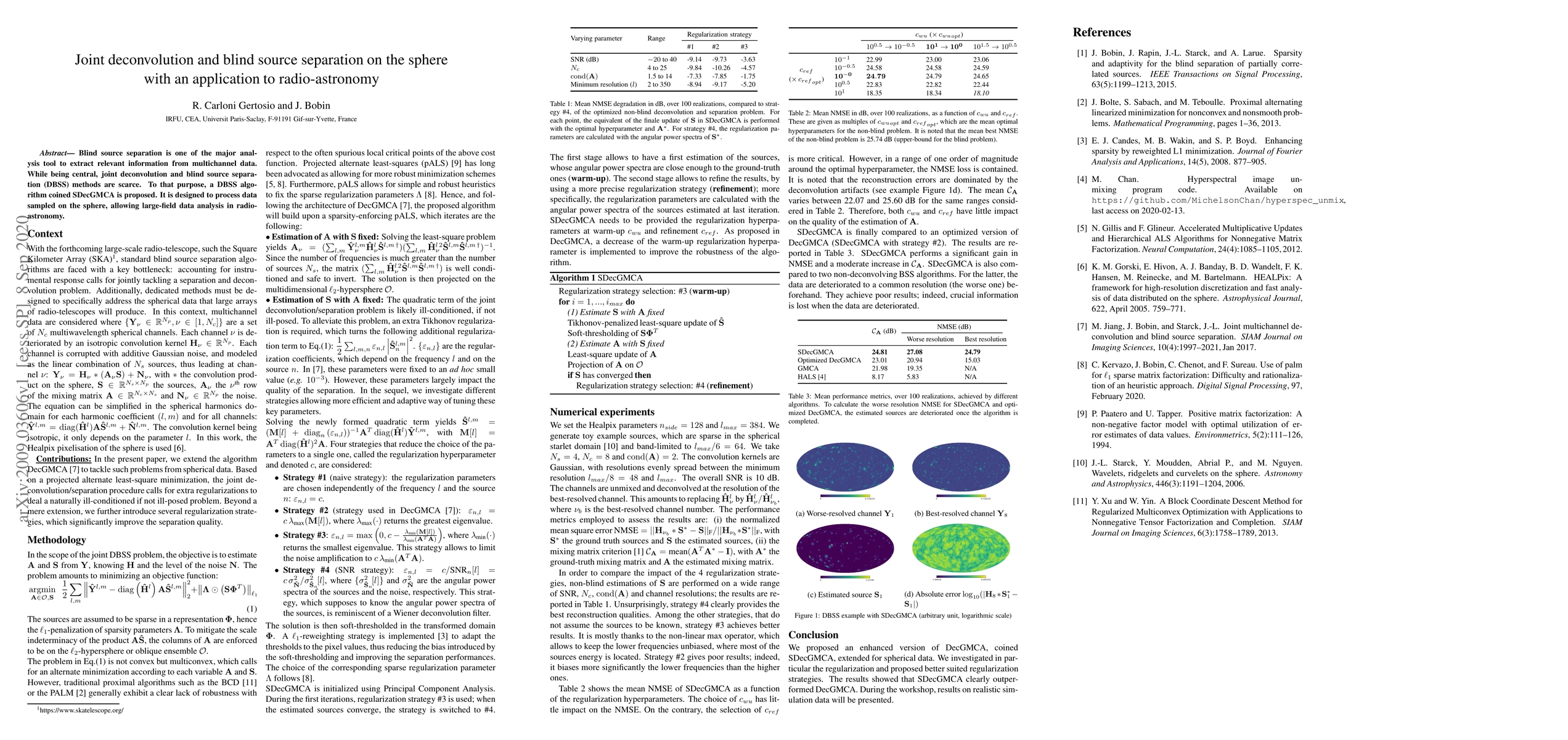 This paper proposes a novel DBSS algorithm named SDecGMCA for joint deconvolution and blind source separation on spherical data, specifically tailored for large-field analysis in radio-astronomy. The method aims to extract relevant information from multichannel data effectively.