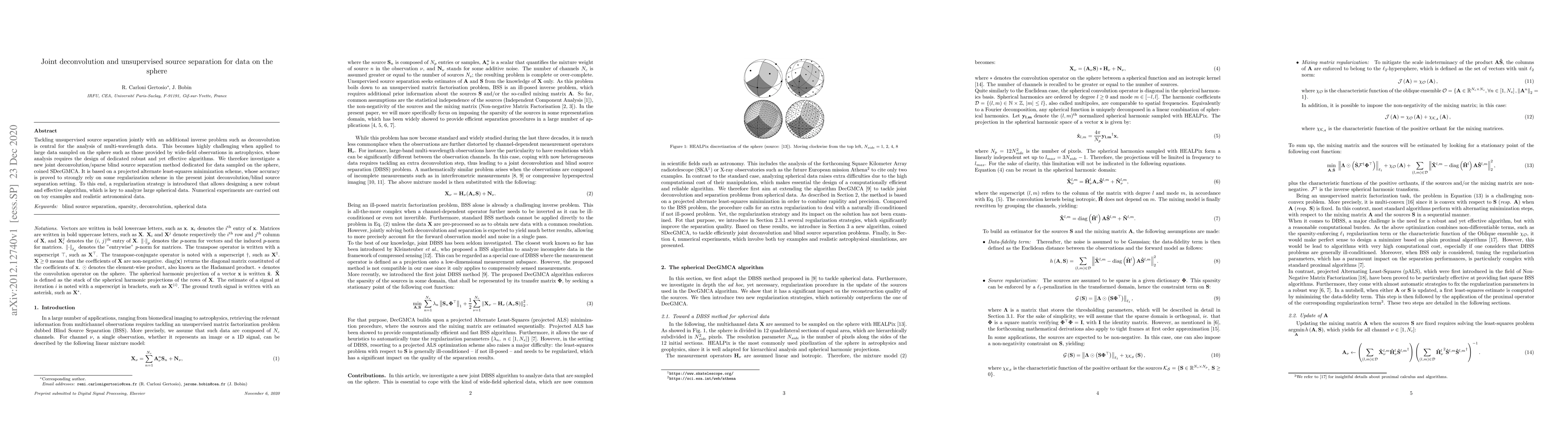 Tackling unsupervised source separation jointly with an additional inverse problem such as deconvolution is central for the analysis of multi-wavelength data. This becomes highly challenging when applied to large data sampled on the sphere such as those provided by wide-field observations in astrophysics, whose analysis requires the design of dedicated robust and yet effective algorithms. We therefore investigate a new joint deconvolution/sparse blind source separation method dedicated for data sampled on the sphere, coined SDecGMCA. It is based on a projected alternate least-squares minimization scheme, whose accuracy is proved to strongly rely on some regularization scheme in the present joint deconvolution/blind source separation setting. To this end, a regularization strategy is introduced that allows designing a new robust and effective algorithm, which is key to analyze large spherical data. Numerical experiments are carried out on toy examples and realistic astronomical data.