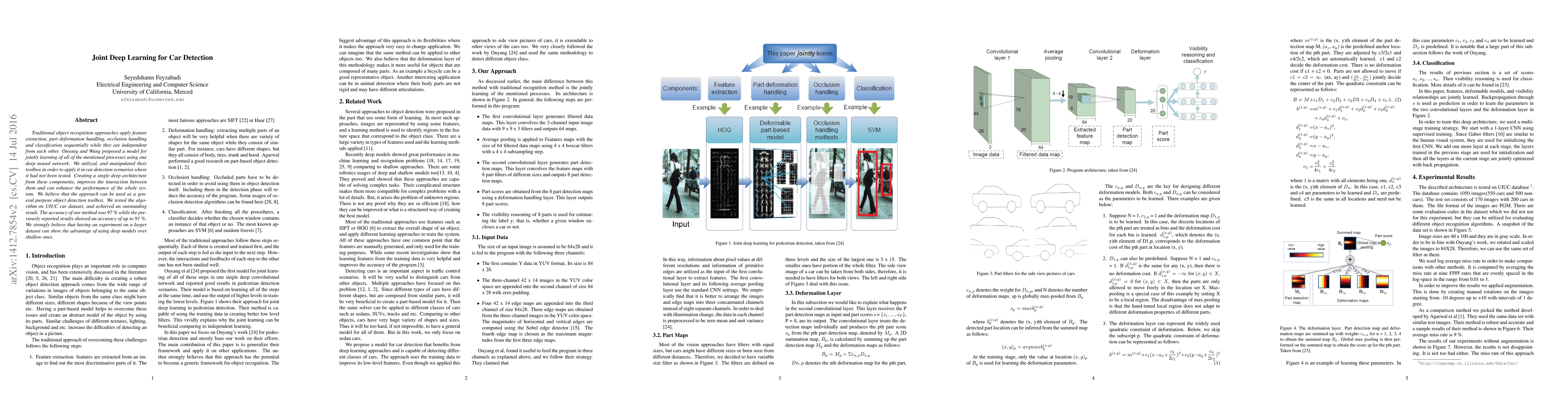Traditional object recognition approaches apply feature extraction, part deformation handling, occlusion handling and classification sequentially while they are independent from each other. Ouyang and Wang proposed a model for jointly learning of all of the mentioned processes using one deep neural network. We utilized, and manipulated their toolbox in order to apply it in car detection scenarios where it had not been tested. Creating a single deep architecture from these components, improves the interaction between them and can enhance the performance of the whole system. We believe that the approach can be used as a general purpose object detection toolbox. We tested the algorithm on UIUC car dataset, and achieved an outstanding result. The accuracy of our method was 97 % while the previously reported results showed an accuracy of up to 91 %. We strongly believe that having an experiment on a larger dataset can show the advantage of using deep models over shallow ones.