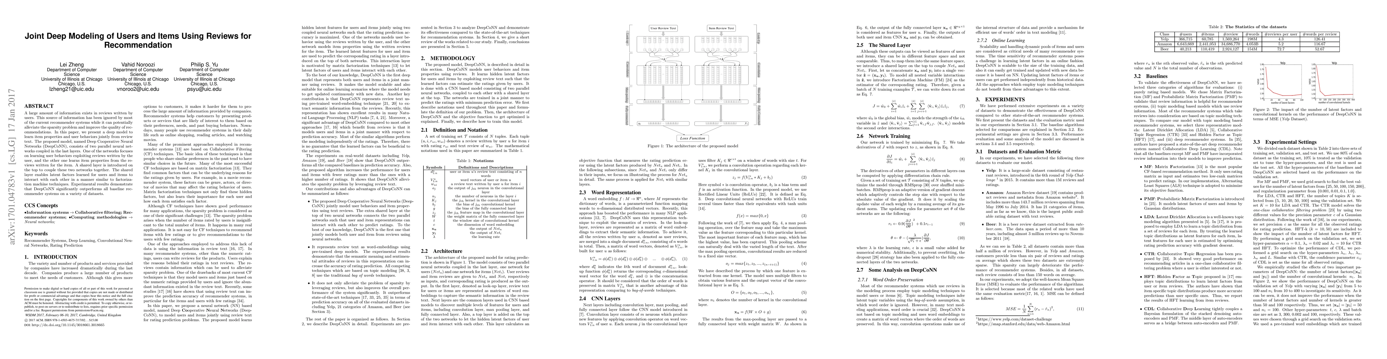 This paper introduces Deep Cooperative Neural Networks (DeepCoNN), a deep model that jointly learns user behaviors and item properties from review text to improve recommendation quality and address sparsity issues. DeepCoNN combines two parallel neural networks with a shared layer, showing superior performance over baseline recommender systems in experiments.