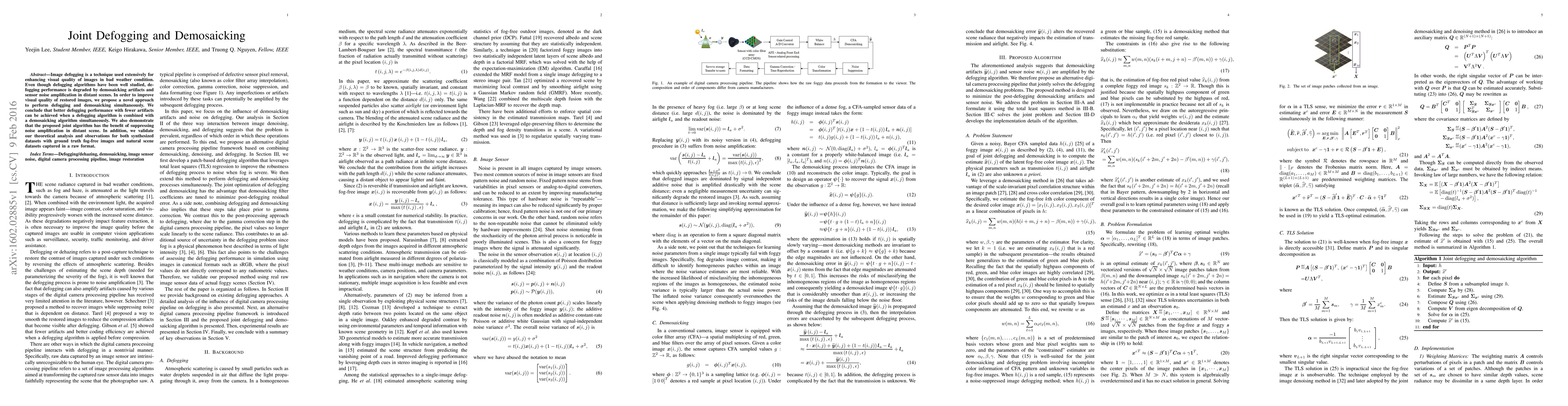 This paper proposes a novel joint defogging and demosaicking algorithm to improve image quality in bad weather conditions by simultaneously addressing both defogging and demosaicking issues. The approach demonstrates superior defogging performance with fewer artifacts and reduced noise amplification in distant scenes compared to separate defogging and demosaicking methods.