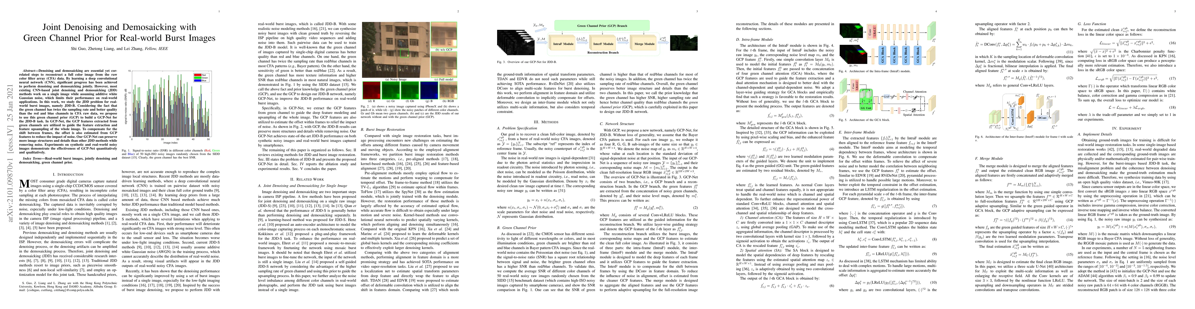 This paper proposes GCP-Net, a deep convolutional neural network leveraging the green channel prior for joint denoising and demosaicking of real-world burst images. The GCP-Net utilizes green channel features to guide the entire image processing, enhancing detail preservation and noise removal while compensating for frame shifts.