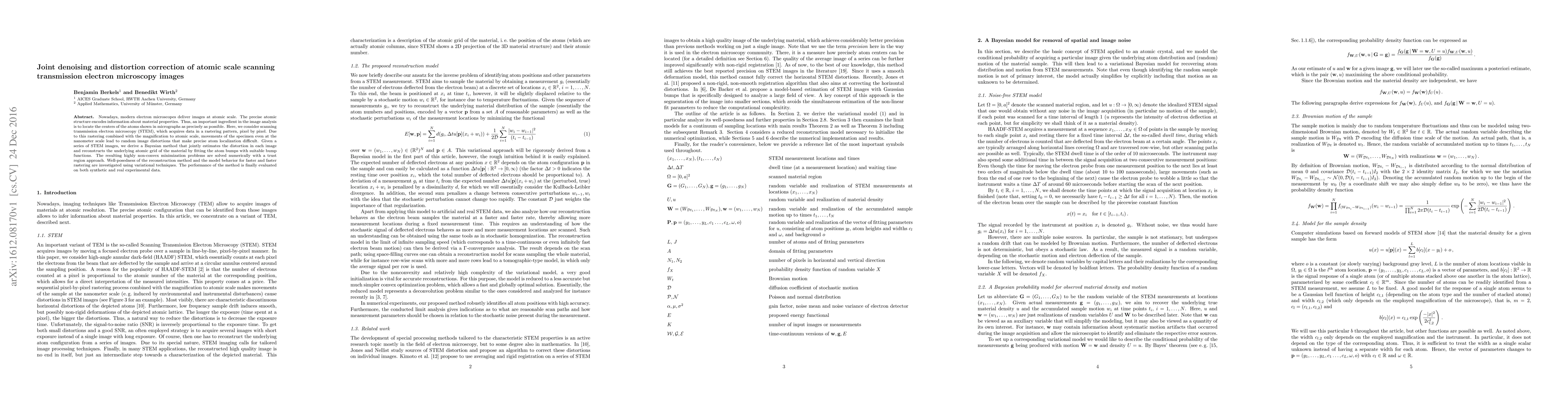 Nowadays, modern electron microscopes deliver images at atomic scale. The precise atomic structure encodes information about material properties. Thus, an important ingredient in the image analysis is to locate the centers of the atoms shown in micrographs as precisely as possible. Here, we consider scanning transmission electron microscopy (STEM), which acquires data in a rastering pattern, pixel by pixel. Due to this rastering combined with the magnification to atomic scale, movements of the specimen even at the nanometer scale lead to random image distortions that make precise atom localization difficult. Given a series of STEM images, we derive a Bayesian method that jointly estimates the distortion in each image and reconstructs the underlying atomic grid of the material by fitting the atom bumps with suitable bump functions. The resulting highly non-convex minimization problems are solved numerically with a trust region approach. Well-posedness of the reconstruction method and the model behavior for faster and faster rastering are investigated using variational techniques. The performance of the method is finally evaluated on both synthetic and real experimental data.
