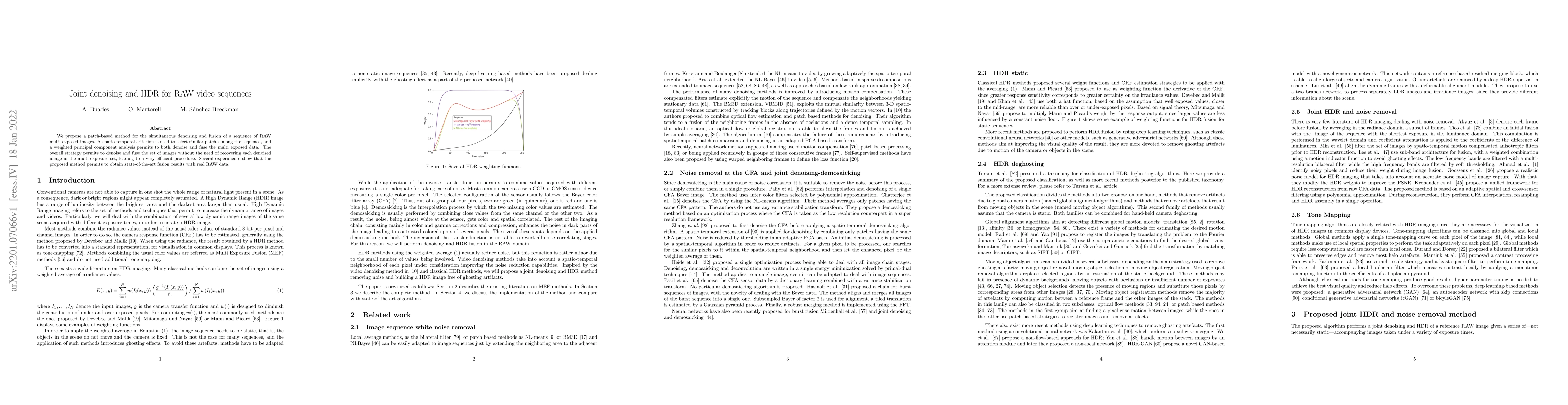 This paper introduces a patch-based method for denoising and fusing RAW multi-exposure video sequences using spatio-temporal criteria and weighted PCA, achieving efficient and state-of-the-art fusion results without individually denoising each image.