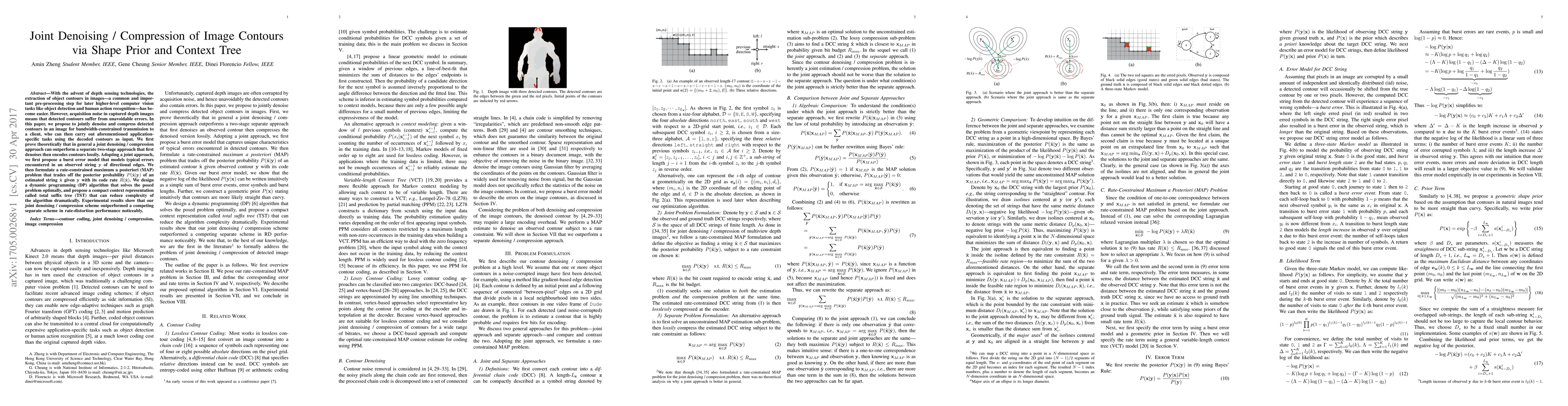 With the advent of depth sensing technologies, the extraction of object contours in images---a common and important pre-processing step for later higher-level computer vision tasks like object detection and human action recognition---has become easier. However, acquisition noise in captured depth images means that detected contours suffer from unavoidable errors. In this paper, we propose to jointly denoise and compress detected contours in an image for bandwidth-constrained transmission to a client, who can then carry out aforementioned application-specific tasks using the decoded contours as input. We first prove theoretically that in general a joint denoising / compression approach can outperform a separate two-stage approach that first denoises then encodes contours lossily. Adopting a joint approach, we first propose a burst error model that models typical errors encountered in an observed string y of directional edges. We then formulate a rate-constrained maximum a posteriori (MAP) problem that trades off the posterior probability p(x'|y) of an estimated string x' given y with its code rate R(x'). We design a dynamic programming (DP) algorithm that solves the posed problem optimally, and propose a compact context representation called total suffix tree (TST) that can reduce complexity of the algorithm dramatically. Experimental results show that our joint denoising / compression scheme outperformed a competing separate scheme in rate-distortion performance noticeably.