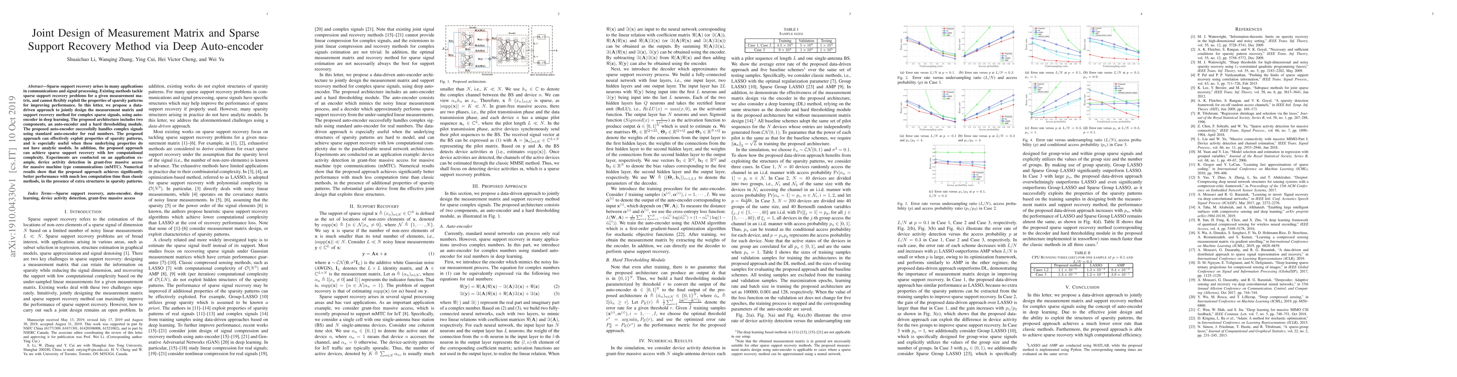 This paper proposes a data-driven method using a deep auto-encoder to jointly design a measurement matrix and a sparse support recovery technique for complex signals. The approach effectively exploits sparsity patterns without analytic models and achieves better performance with lower computational complexity, demonstrated through device activity detection in mMTC applications.