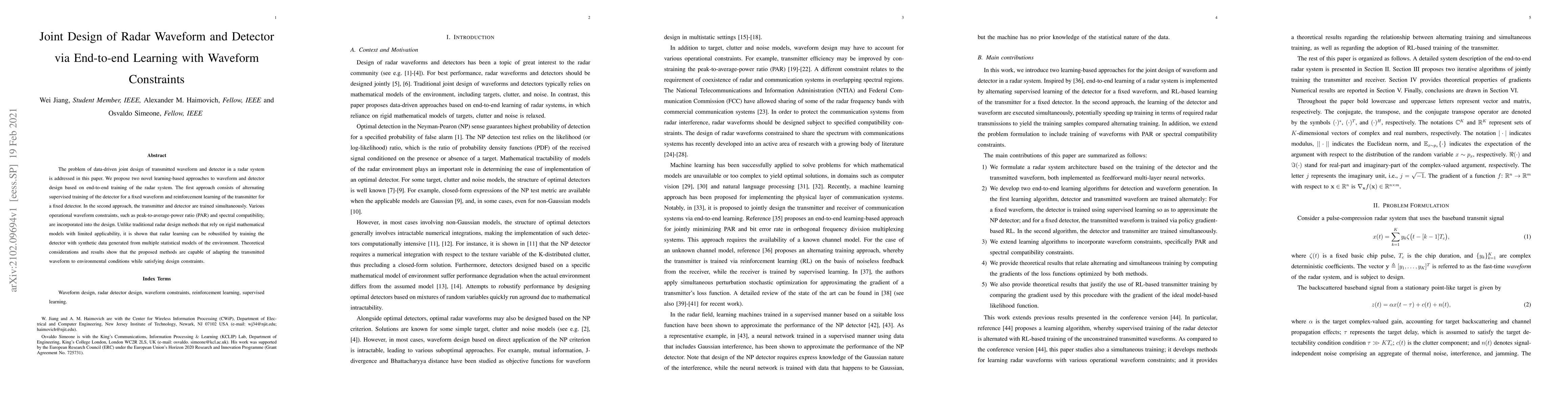 This paper proposes two novel learning-based methods for jointly designing radar waveforms and detectors through end-to-end training, incorporating operational constraints. The methods demonstrate adaptability to environmental conditions while satisfying constraints, outperforming traditional rigid mathematical models.
