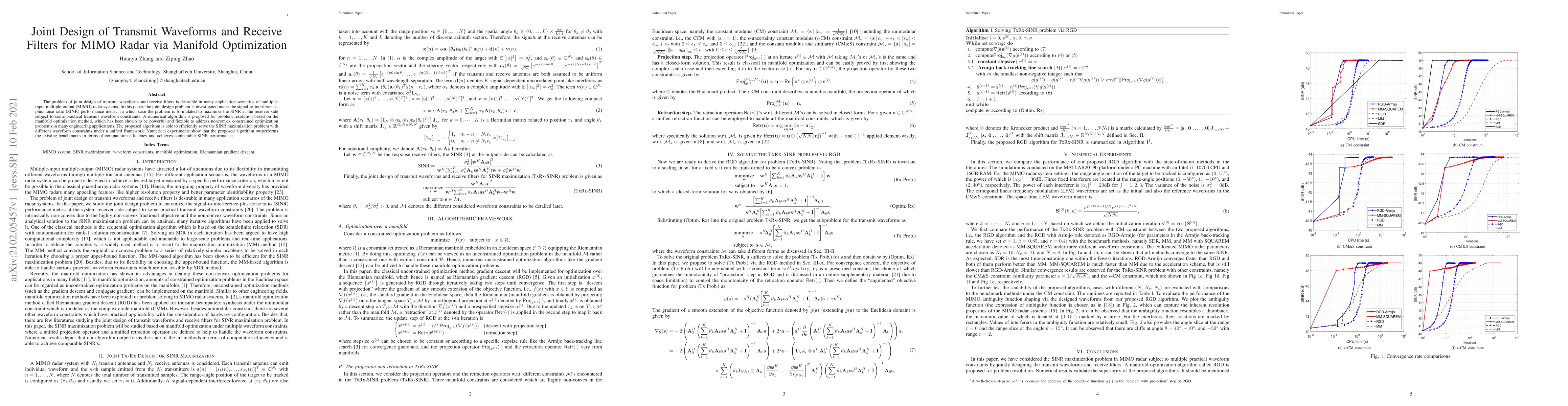 This paper proposes a manifold optimization method to jointly design transmit waveforms and receive filters for MIMO radar systems to maximize signal-to-interference-plus-noise ratio (SINR). The algorithm efficiently solves the nonconvex optimization problem and outperforms existing benchmarks in computational efficiency while achieving comparable SINR performance.