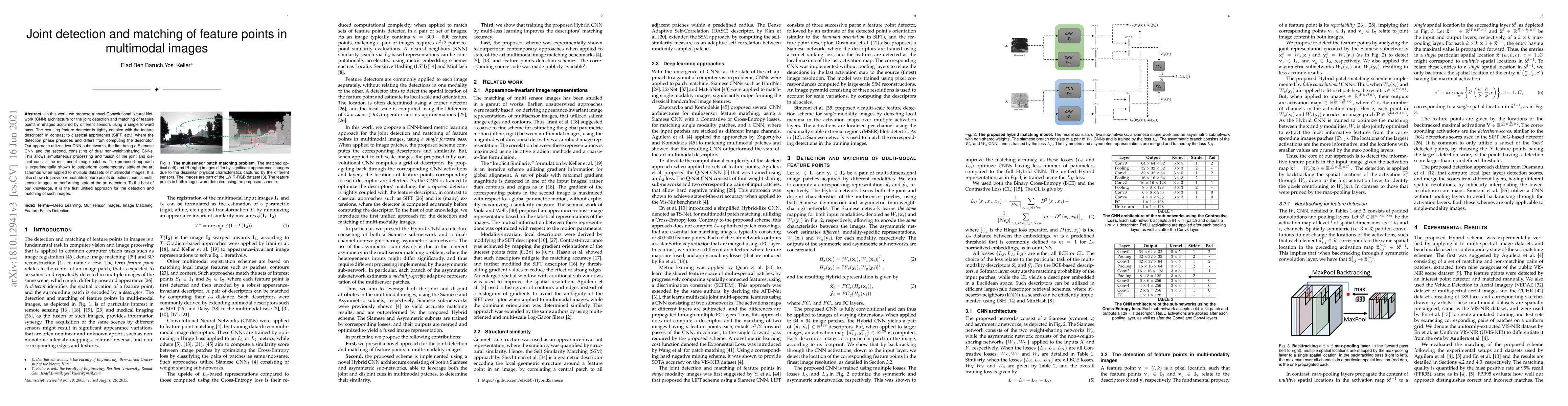 This paper introduces a novel CNN architecture for jointly detecting and matching feature points in multimodal images, utilizing a Siamese CNN and dual non-weight-sharing CNNs for simultaneous processing. The approach outperforms existing methods and provides repeatable detections across different sensor images.