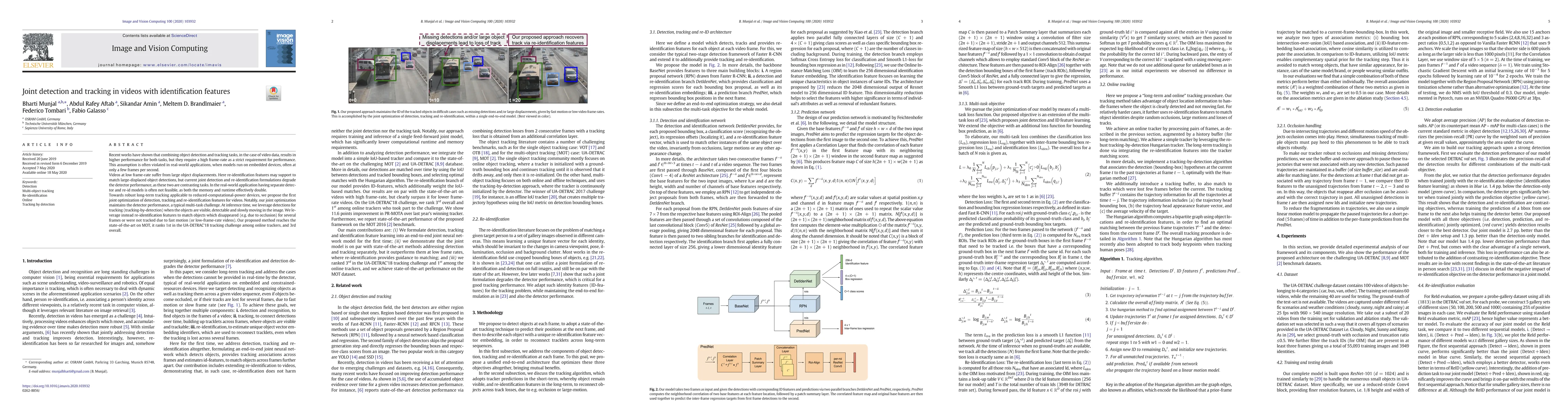 Recent works have shown that combining object detection and tracking tasks, in the case of video data, results in higher performance for both tasks, but they require a high frame-rate as a strict requirement for performance. This is assumption is often violated in real-world applications, when models run on embedded devices, often at only a few frames per second. Videos at low frame-rate suffer from large object displacements. Here re-identification features may support to match large-displaced object detections, but current joint detection and re-identification formulations degrade the detector performance, as these two are contrasting tasks. In the real-world application having separate detector and re-id models is often not feasible, as both the memory and runtime effectively double. Towards robust long-term tracking applicable to reduced-computational-power devices, we propose the first joint optimization of detection, tracking and re-identification features for videos. Notably, our joint optimization maintains the detector performance, a typical multi-task challenge. At inference time, we leverage detections for tracking (tracking-by-detection) when the objects are visible, detectable and slowly moving in the image. We leverage instead re-identification features to match objects which disappeared (e.g. due to occlusion) for several frames or were not tracked due to fast motion (or low-frame-rate videos). Our proposed method reaches the state-of-the-art on MOT, it ranks 1st in the UA-DETRAC'18 tracking challenge among online trackers, and 3rd overall.